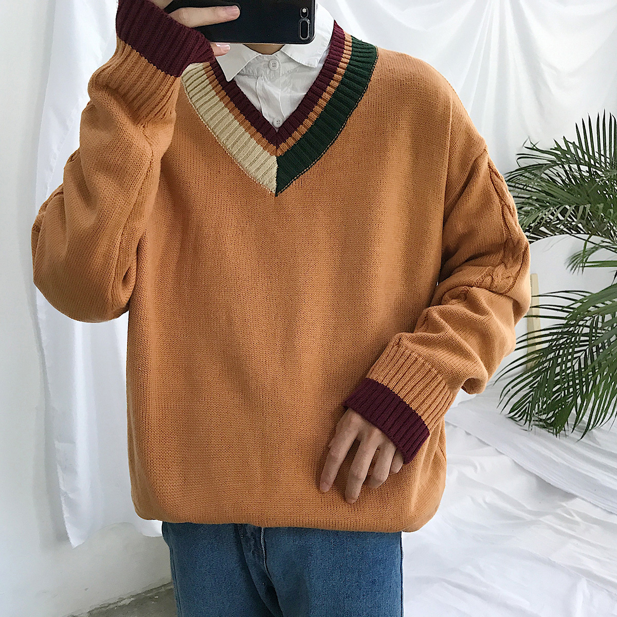 文藝男女店V領毛衣男士秋季潮流寬松針織衫新款韓版休閑衣服秋裝