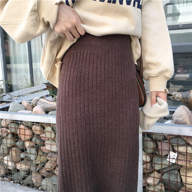復古風針織半身裙秋裝女2018新款高腰顯瘦包臀裙純色開叉中長裙子