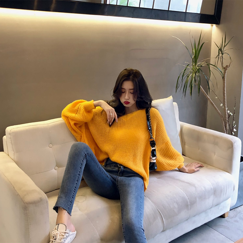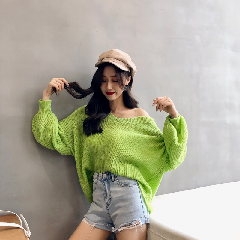 / chic早秋上衣慵懶寬松糖果色網紅毛衣女韓版純色時尚V領針織衫潮