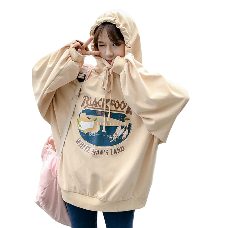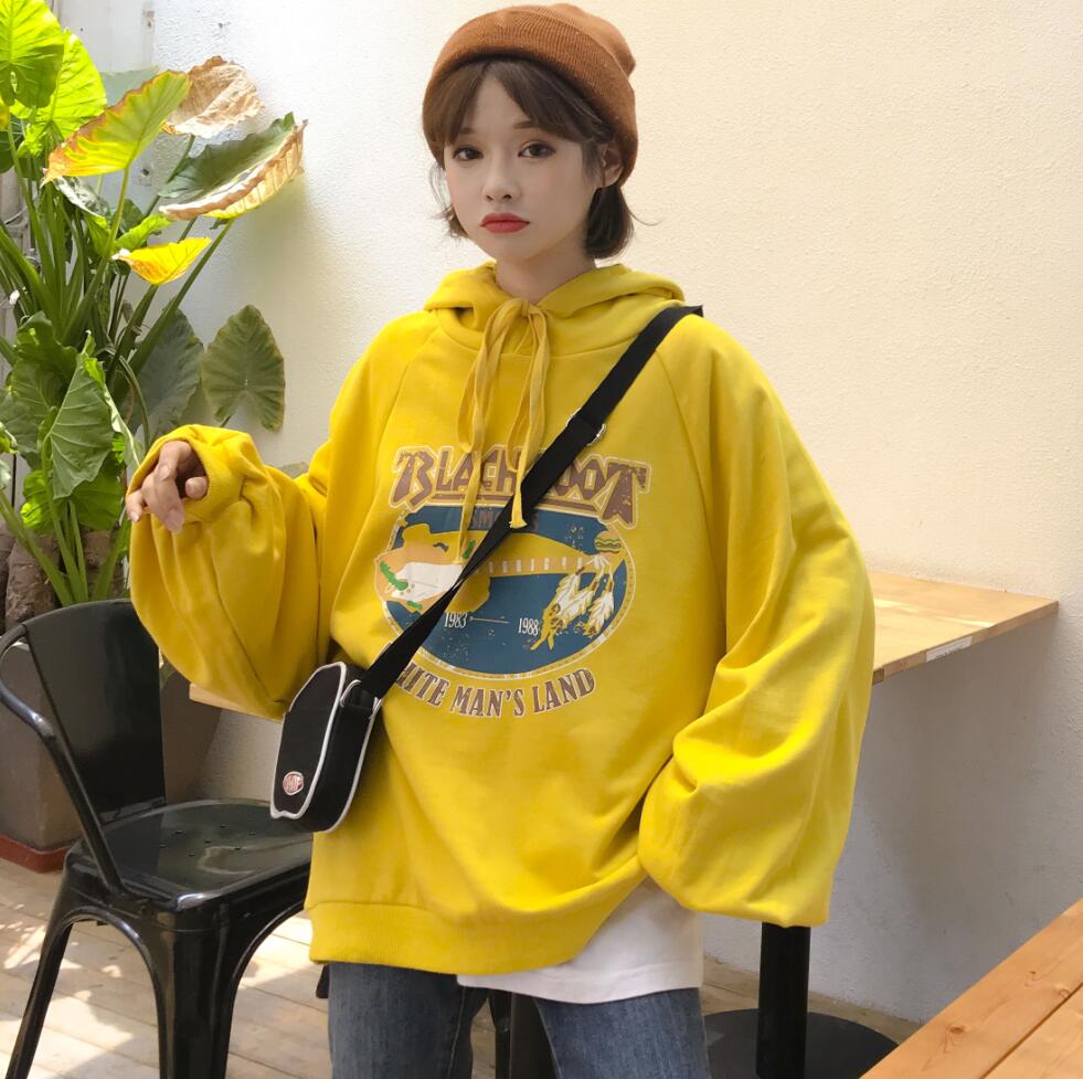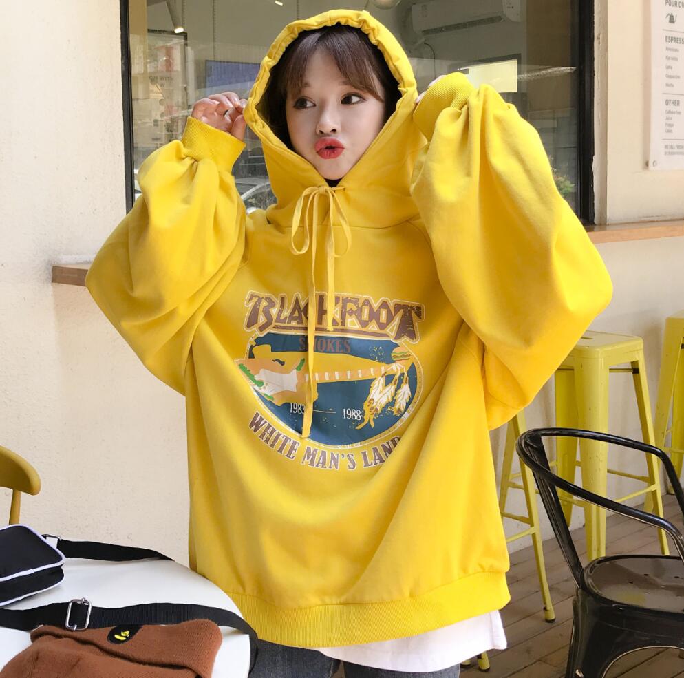 / 秋季女裝韓版中長款原宿風寬松卡通抽繩連帽長袖套頭衛衣上衣外套