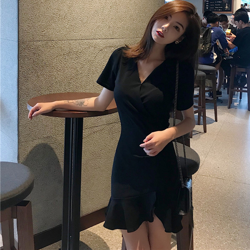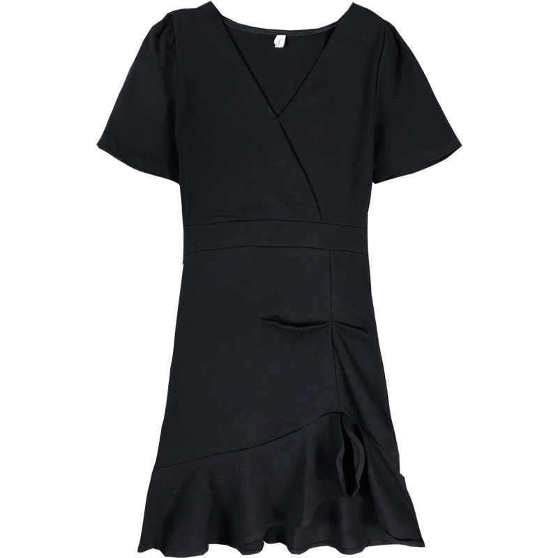 連衣裙女夏季新款韓版女裝修身V領短袖小黑裙高腰包臀不規則短裙