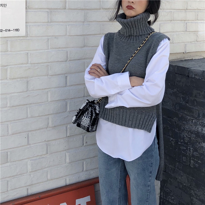 毛衣女2018新款時尚韓版氣質高領百搭襯衫拼接前短后長假兩件上衣