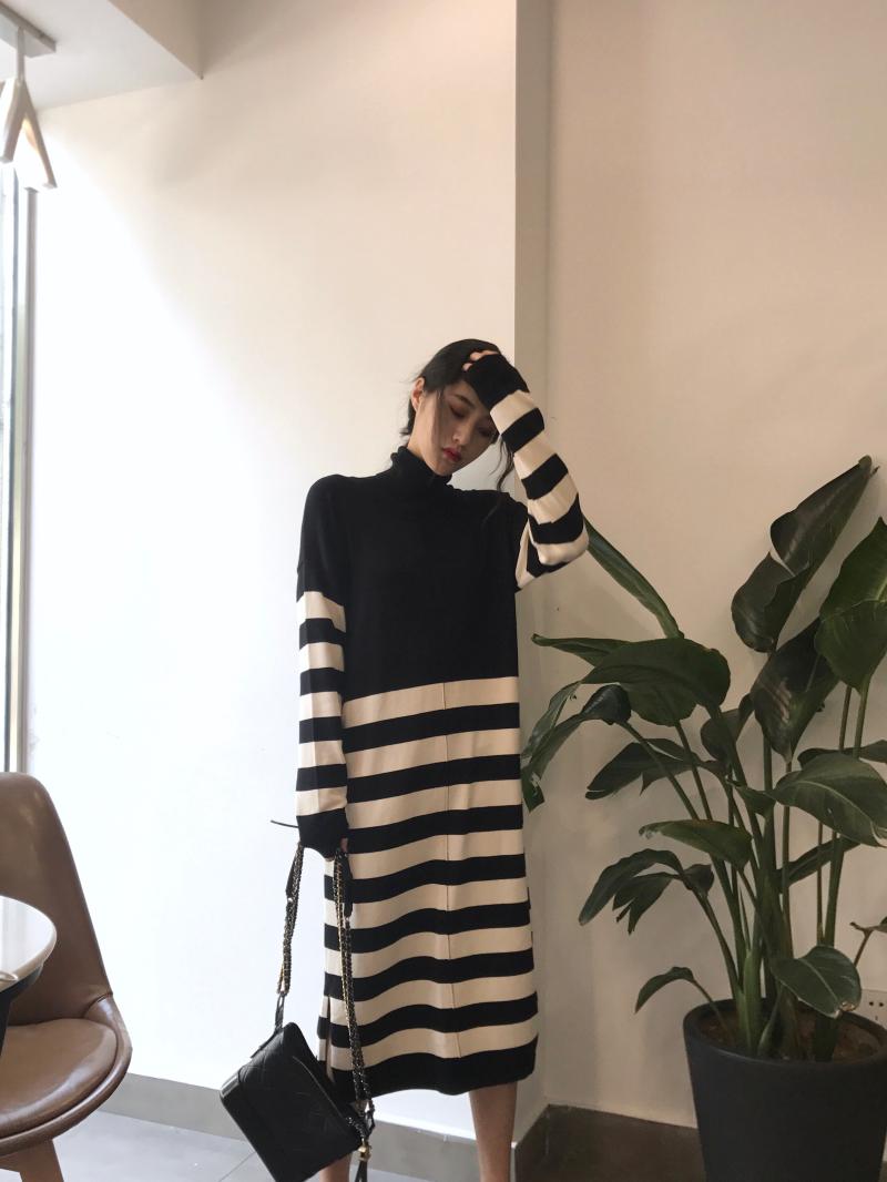 / 晚晚風新款韓版秋冬復古chic時髦百搭拼接條紋針織過膝長款連衣裙