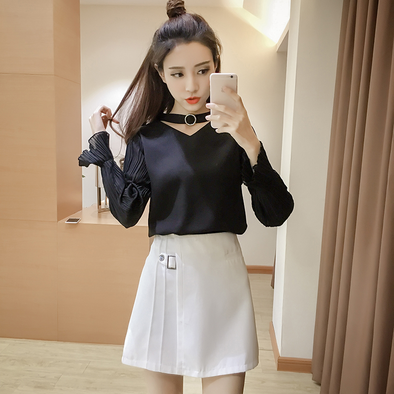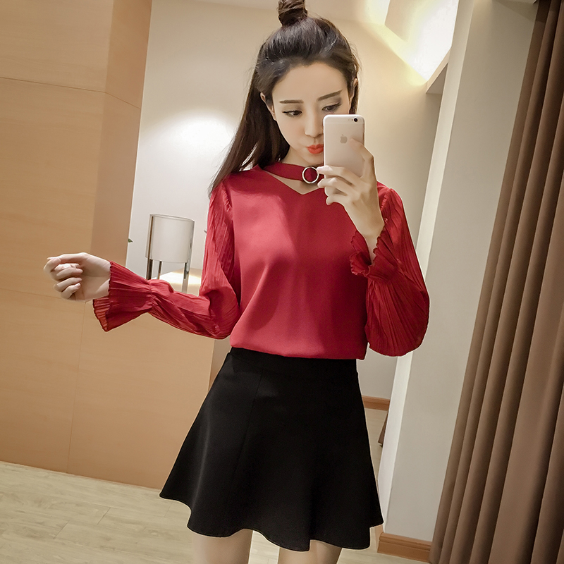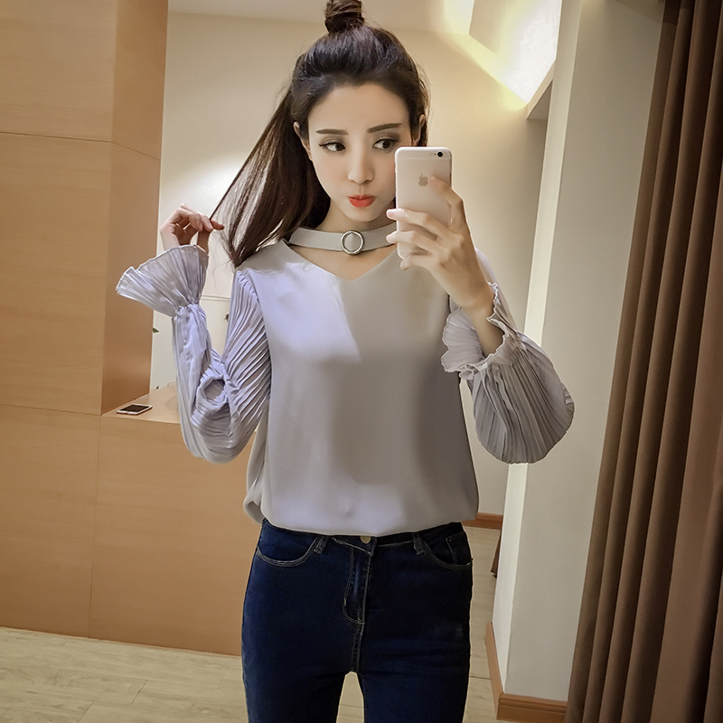 / 春秋裝新款韓版V領雪紡上衣女寬松顯瘦喇叭袖長袖百褶雪紡衫