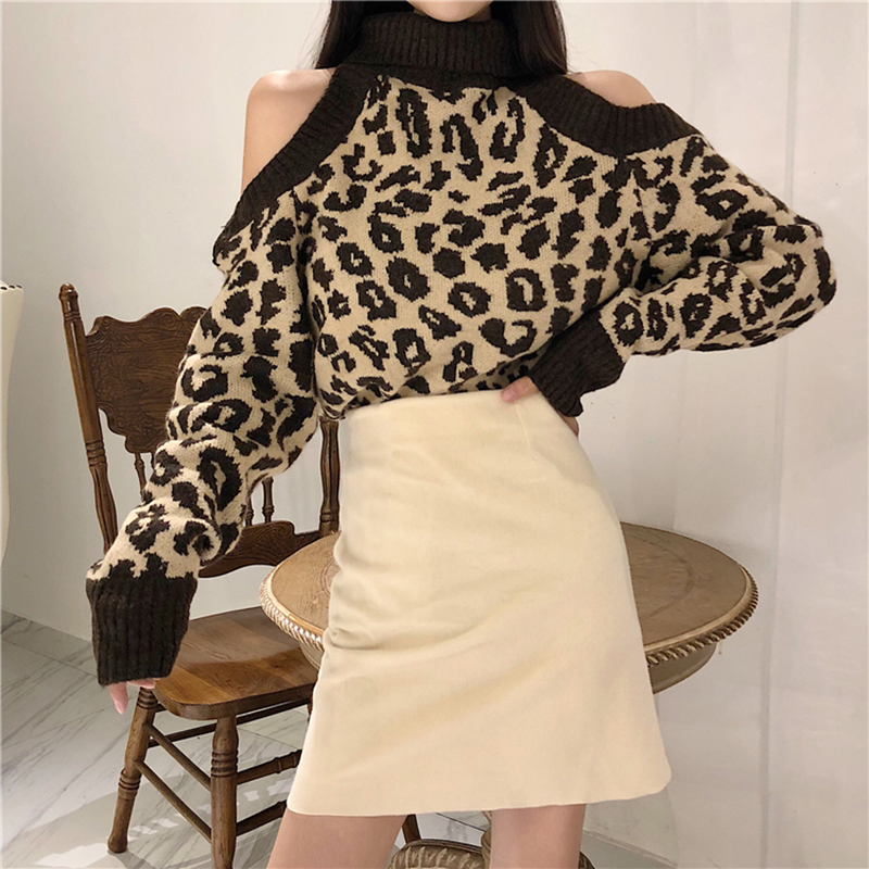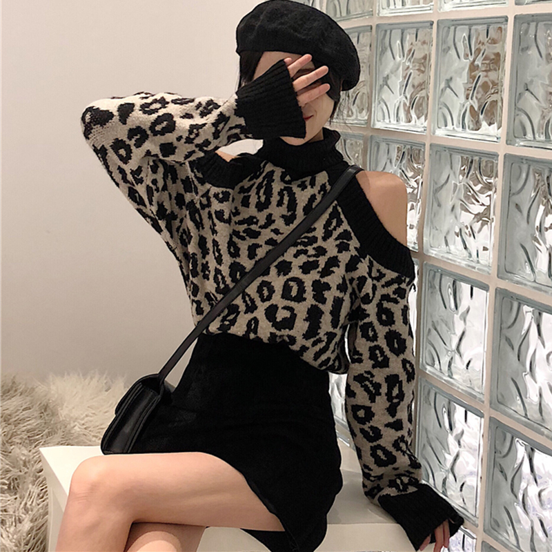 御姐套裝女秋冬新款露肩時尚豹紋針織外套高腰顯瘦A字包臀半身裙