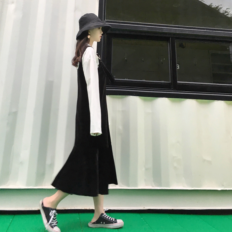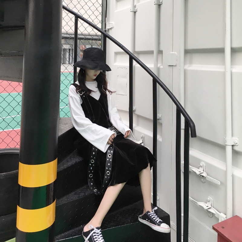 / 2018冬季新款復古韓版chic絲絨百搭不規則扣長款魚擺背帶連衣裙女