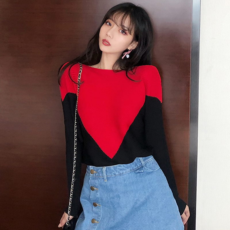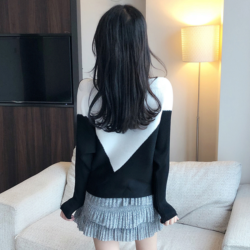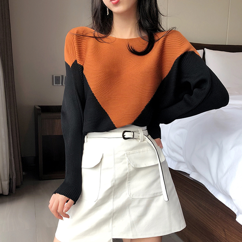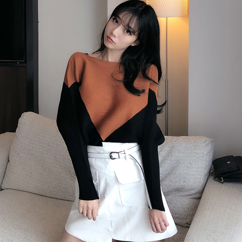 秋冬女裝2018新款韓版拼色長袖針織衫學生寬松蝙蝠長袖打底薄毛衣