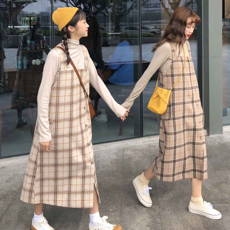學院風套裝女秋2018新款開叉格子背帶連衣裙子修身長袖針織打底衫