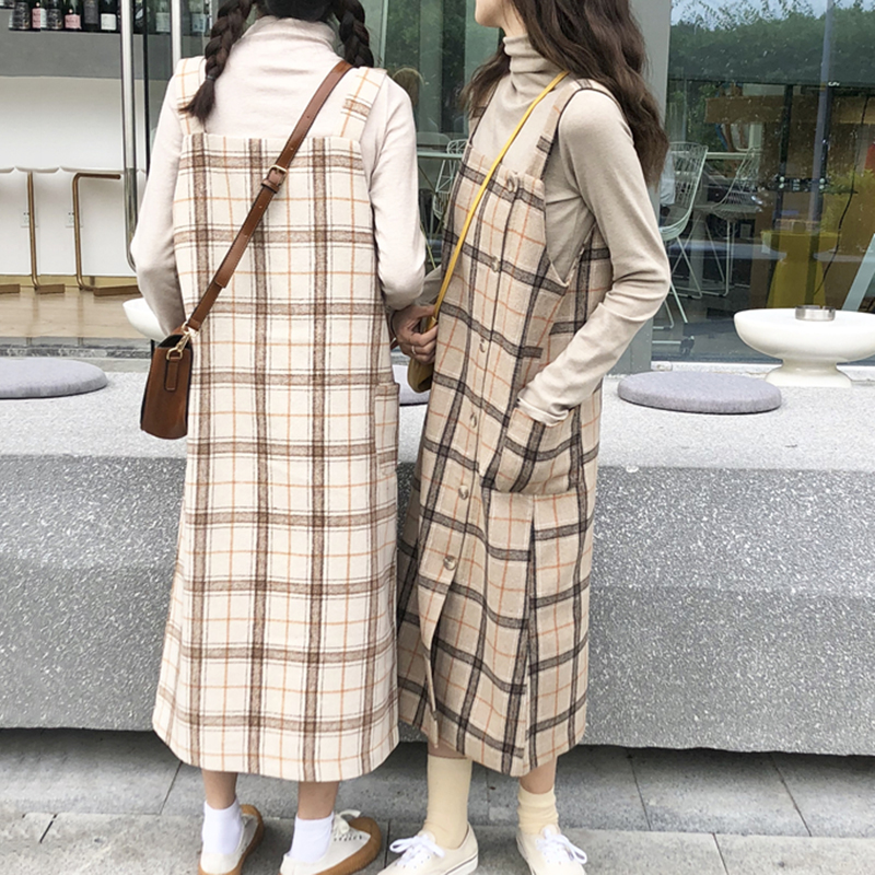 / 學院風套裝女秋2018新款開叉格子背帶連衣裙子修身長袖針織打底衫