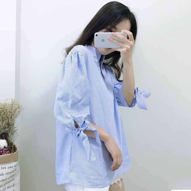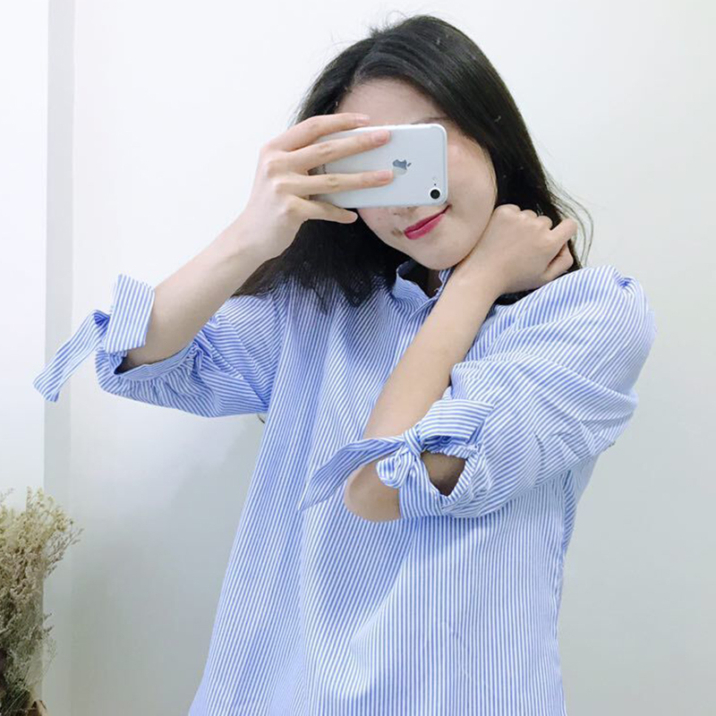 / 時尚條紋學院風系帶長袖襯衫秋冬新款冷系女裝薄外套V領寬松上衣