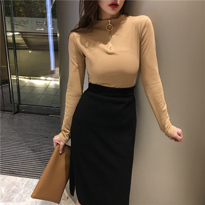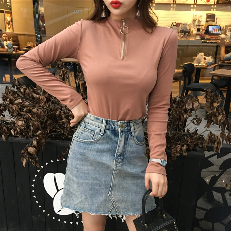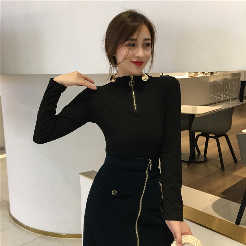 秋裝長袖t恤女2018新款韓版高領拉鏈心機上衣復古時尚百搭打底衫