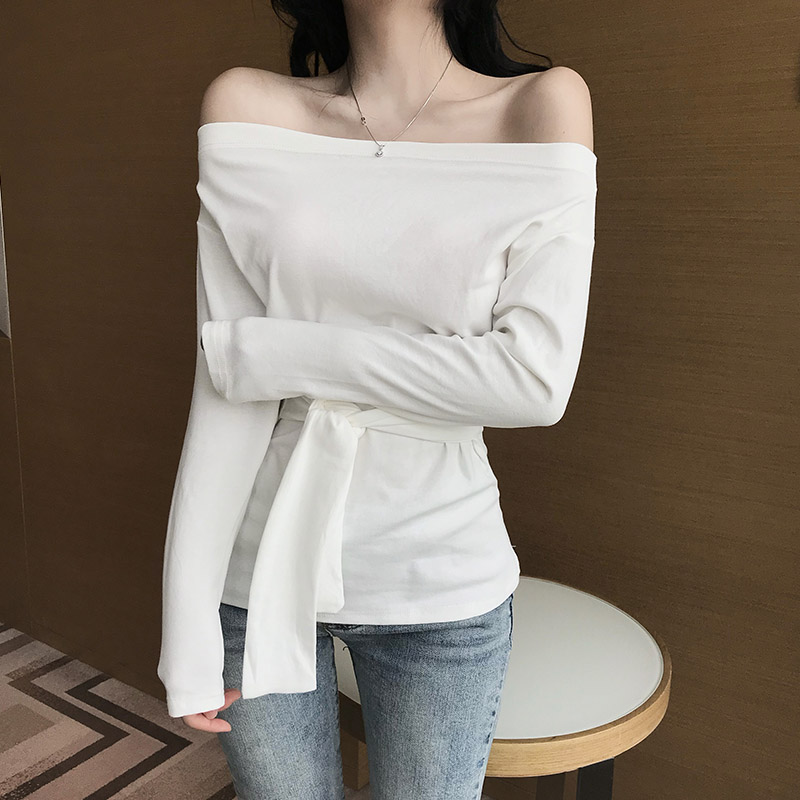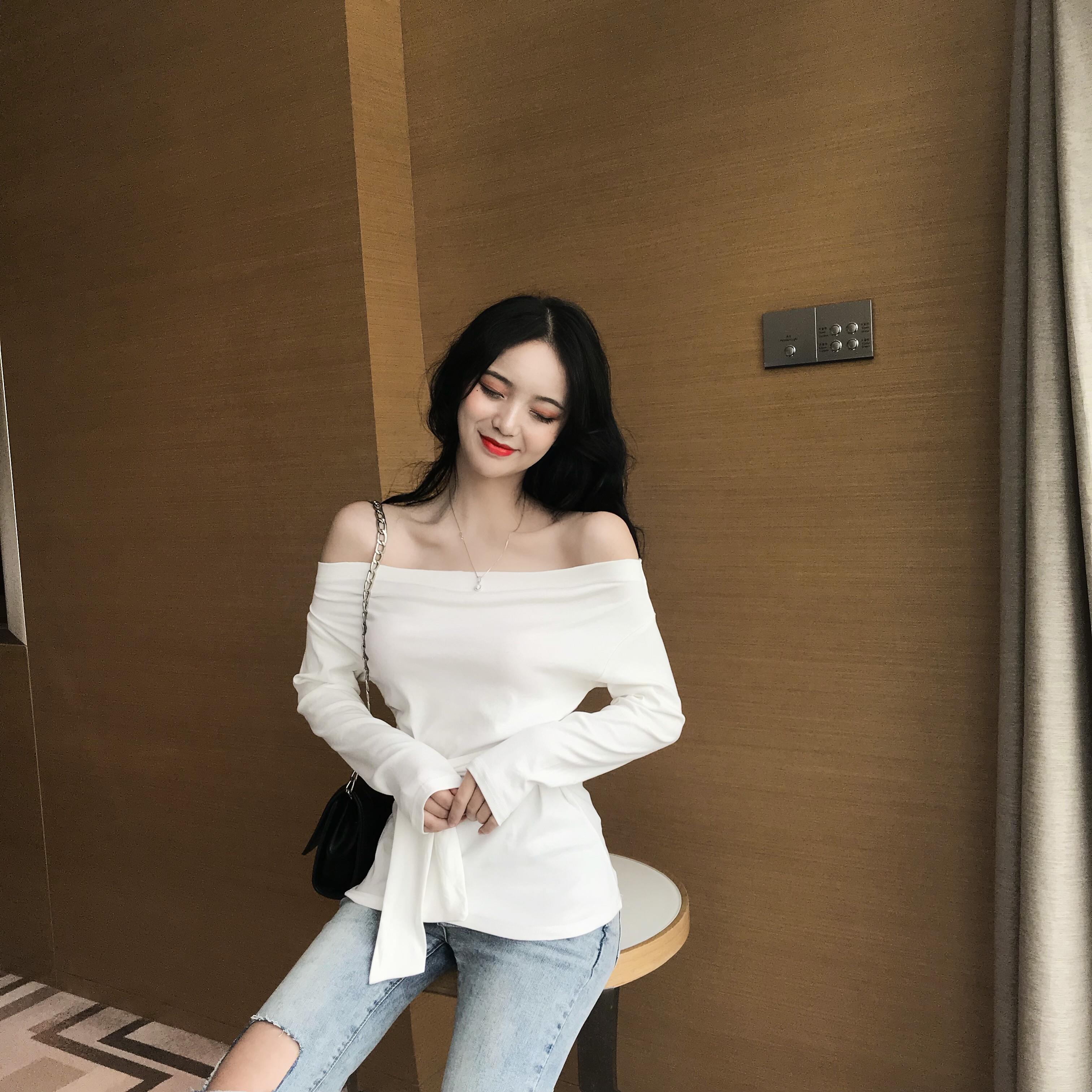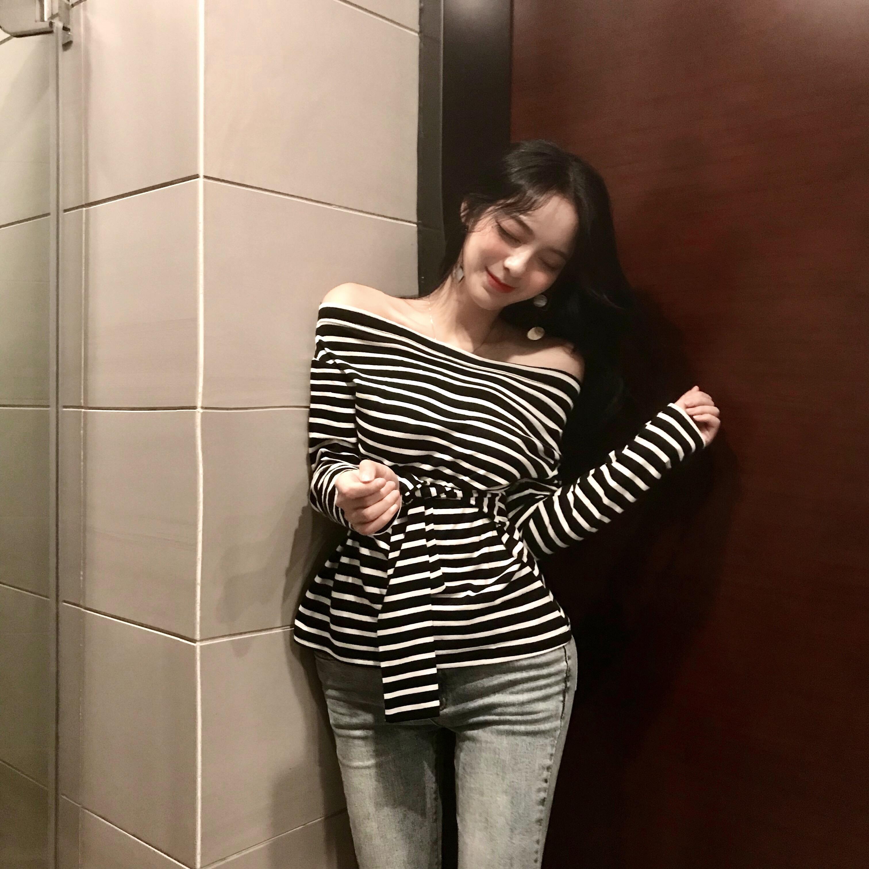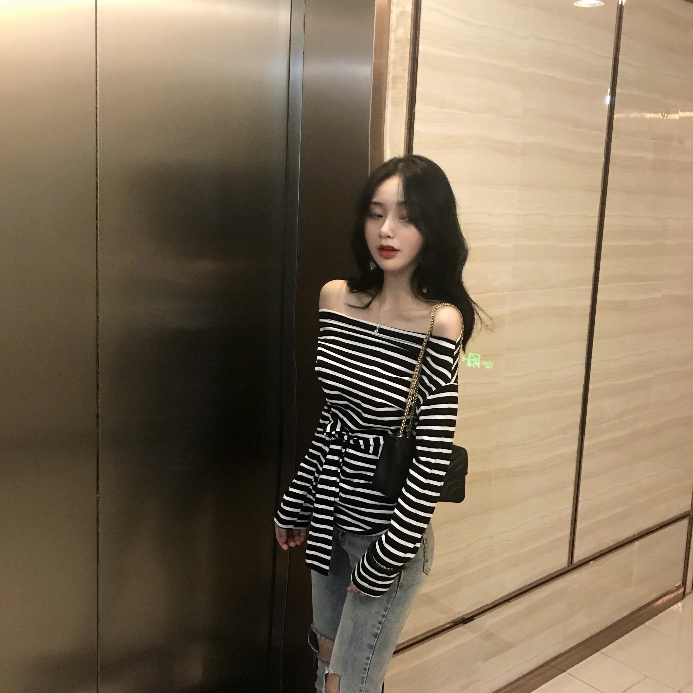 / 2018新款chic條紋一字領露肩修身腰間系帶收腰長袖打底衫上衣女秋
