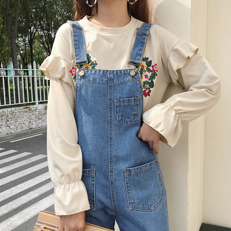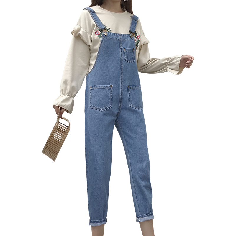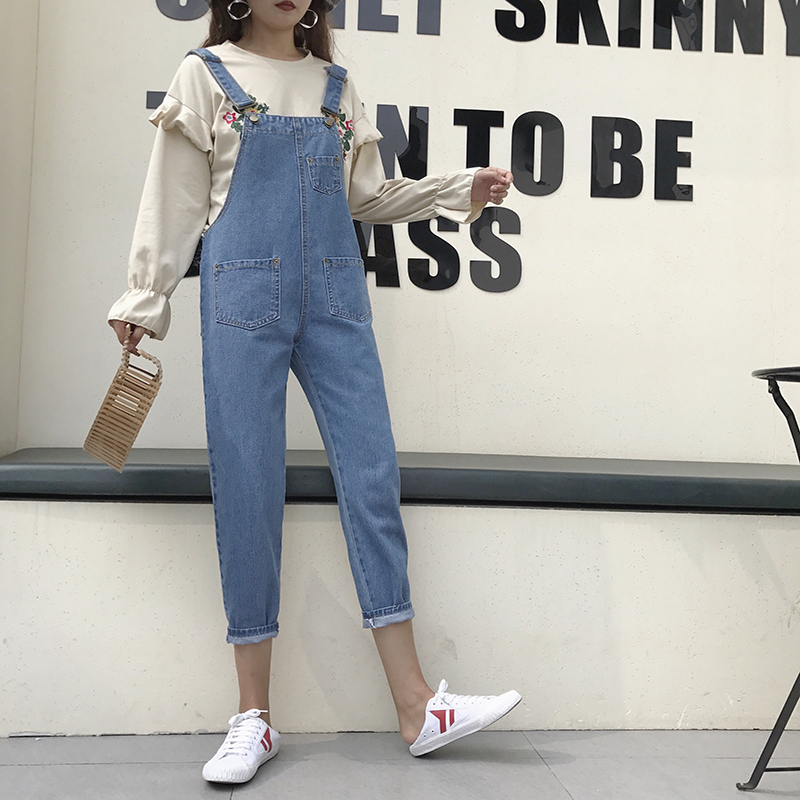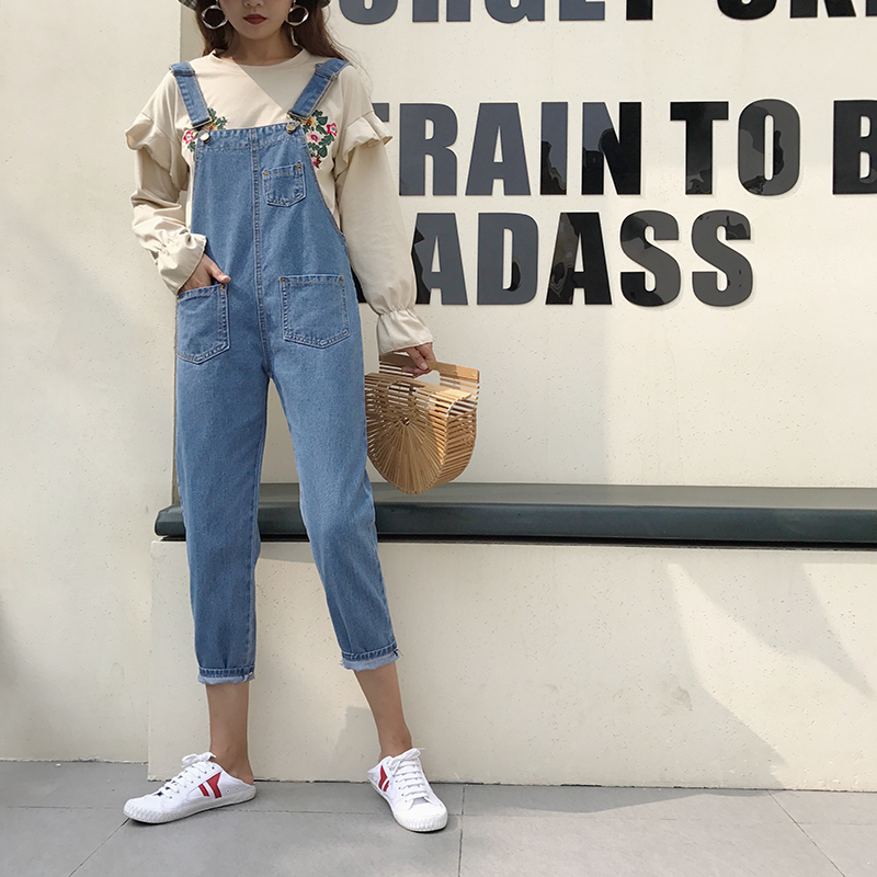 / 春季女裝新款韓版寬松個性背帶褲女寬松休閑長褲口袋牛仔褲連體褲