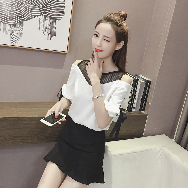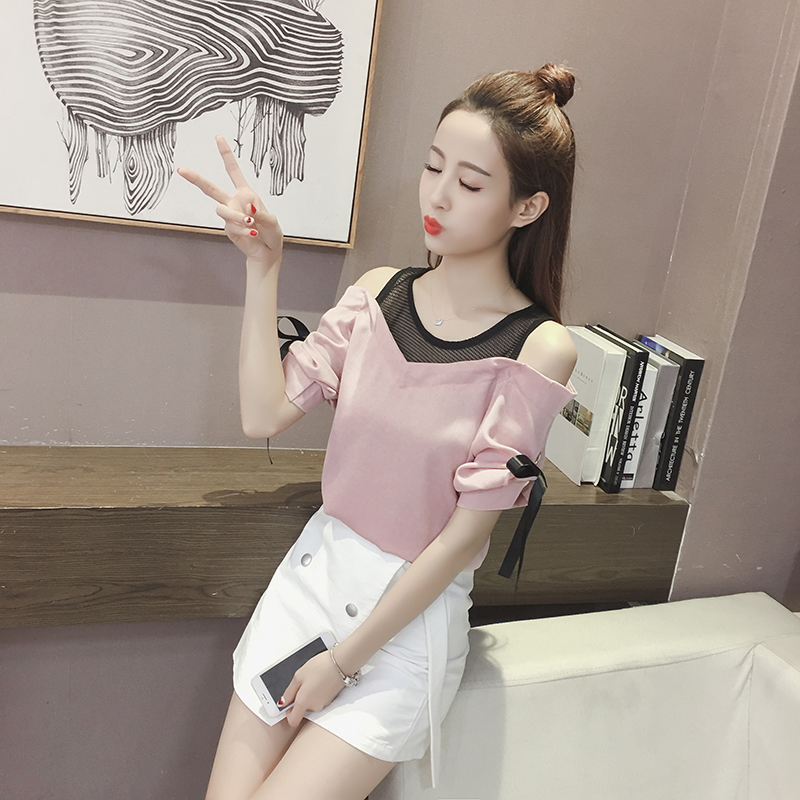 / 小衫女夏季新款韓版網紗拼接一字肩上衣顯瘦百搭短袖雪紡衫潮