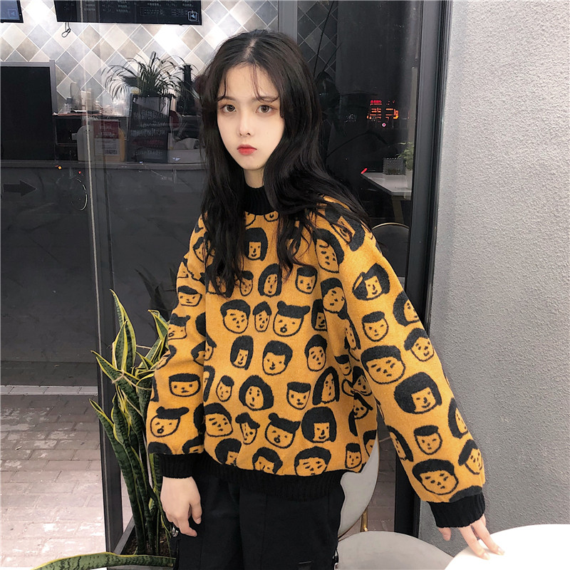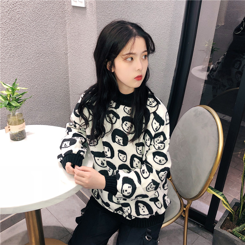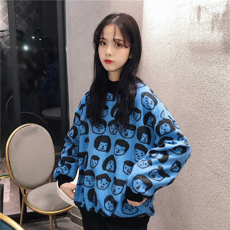 2018新款秋冬韓版寬松原宿風涂鴉毛呢拼接螺紋套頭衛衣上衣外套女