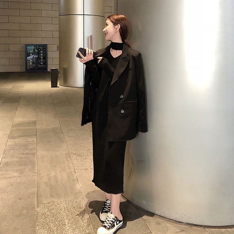 馬海毛網紅毛衣女2018新款針織開衫外套冷淡風針織吊帶連衣裙套裝