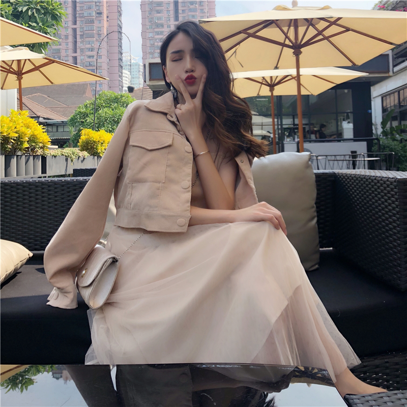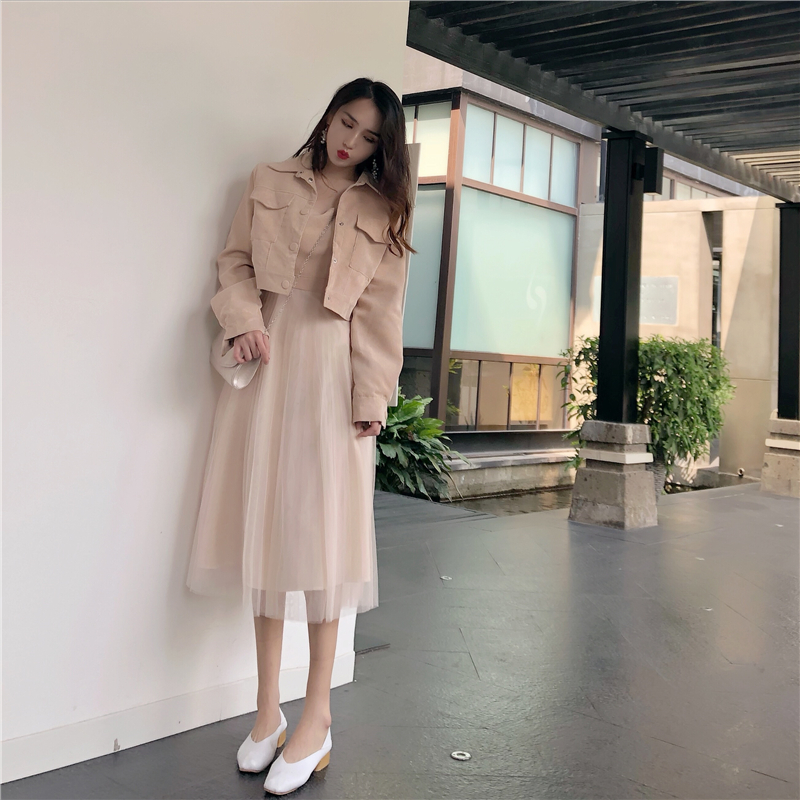 / 時尚套裝女新款韓版氣質吊帶燈芯絨拼接網紗連衣裙短款外套兩件套