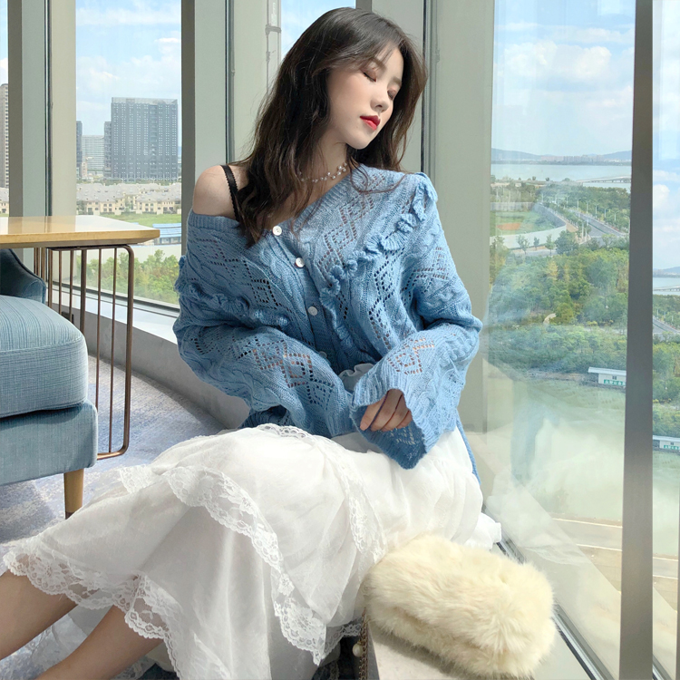 秋裝女2018新款套裝網紅單排扣V領荷葉邊針織長袖+仙女蕾絲蛋糕裙