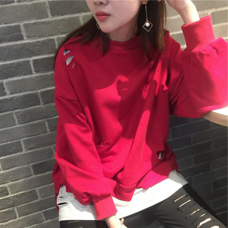 / 不規則破洞長袖假兩件上衣早秋新款韓版女裝學生寬松黑色衛衣外套