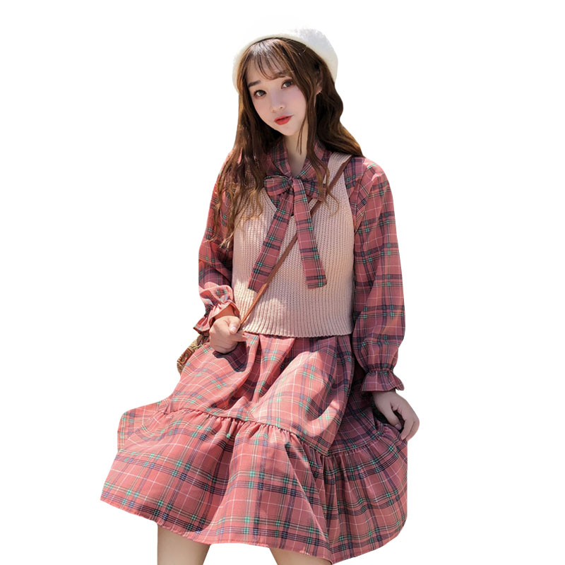 / 韓版時尚休閑套裝秋季女裝chic小清新格子連衣裙+針織馬甲兩件套