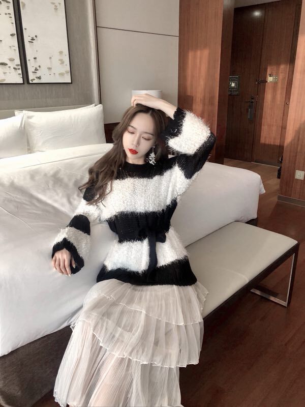 寬松長袖鏤空針織衫套頭外穿慵懶風條紋毛衣蛋糕裙時尚港風套裝女