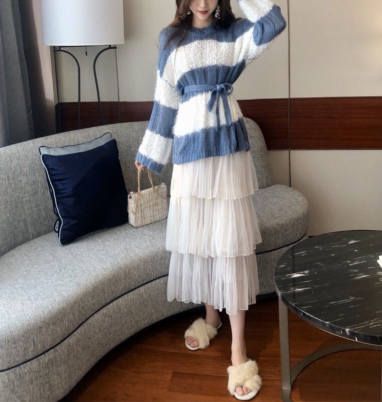 / 寬松長袖鏤空針織衫套頭外穿慵懶風條紋毛衣蛋糕裙時尚港風套裝女
