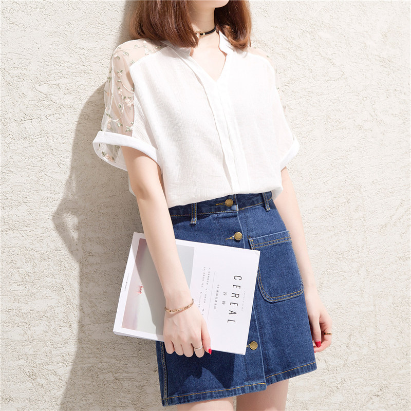 / 白色t恤女小清新露肩上衣bf風V領網紗寬松體恤短袖女夏裝新款