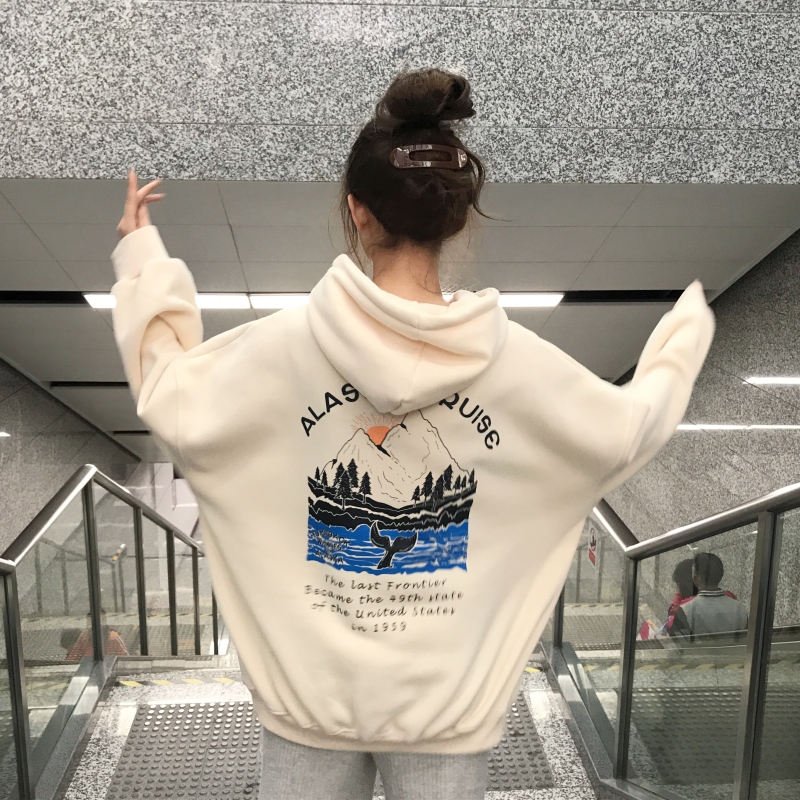 / 秋冬女裝韓版慵懶風寬松原宿風卡通字母加絨加厚連帽衛衣上衣外套