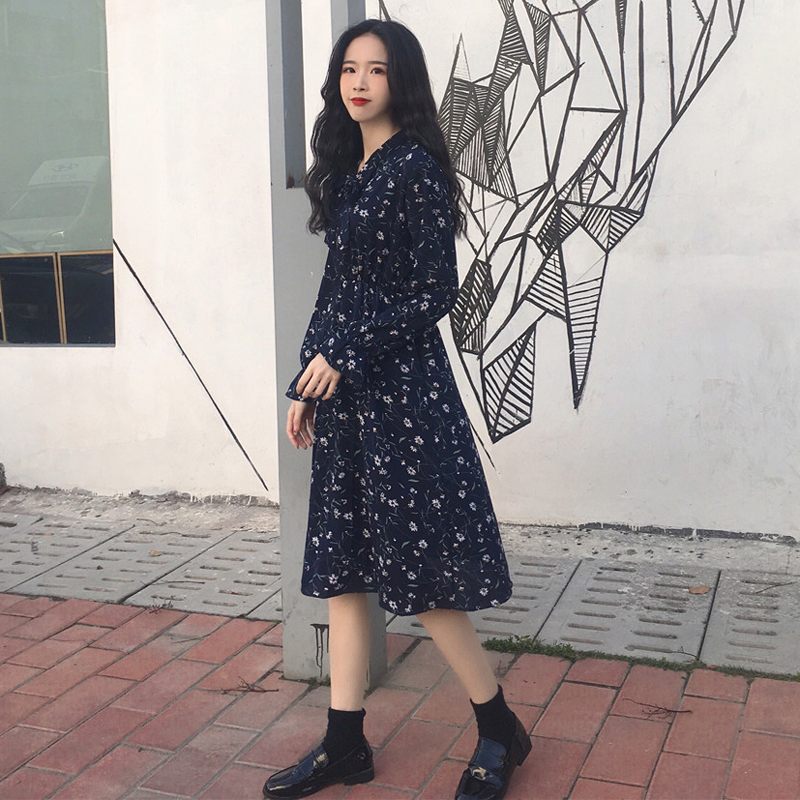 秋裝韓版氣質小清新領口系帶中長款長袖碎花連衣裙顯瘦雪紡長裙女