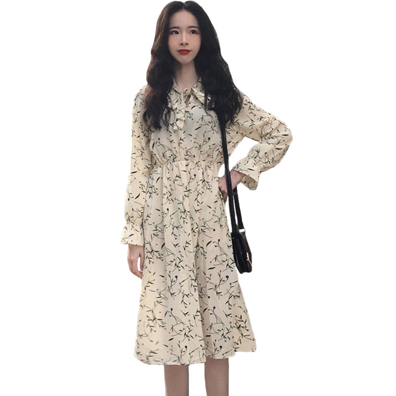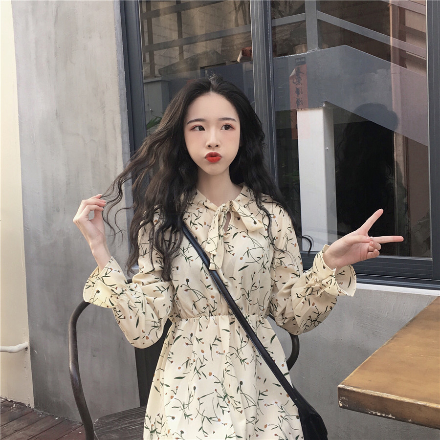 / 秋裝韓版氣質小清新領口系帶中長款長袖碎花連衣裙顯瘦雪紡長裙女