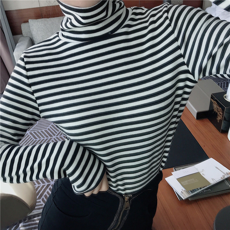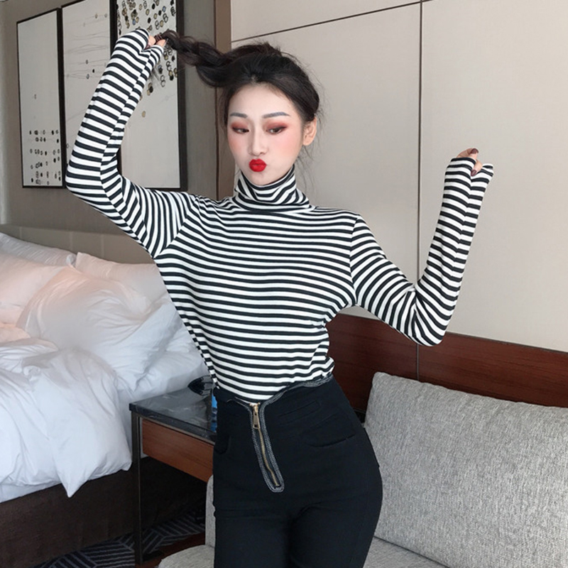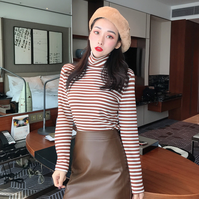 chic高領條紋顯瘦打底衫女冬裝2018新款韓版學生百搭長袖T恤上衣