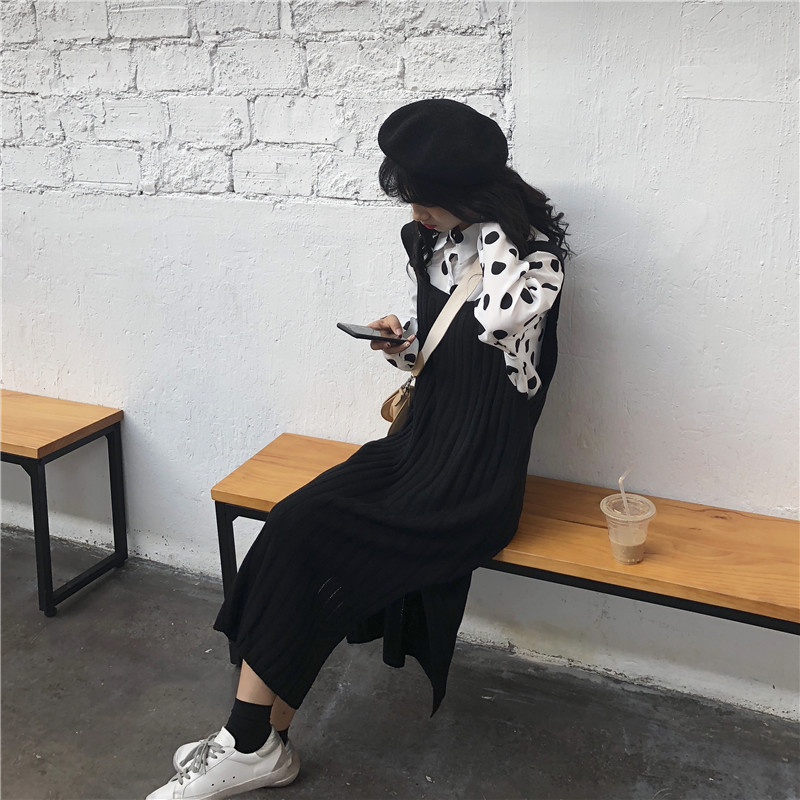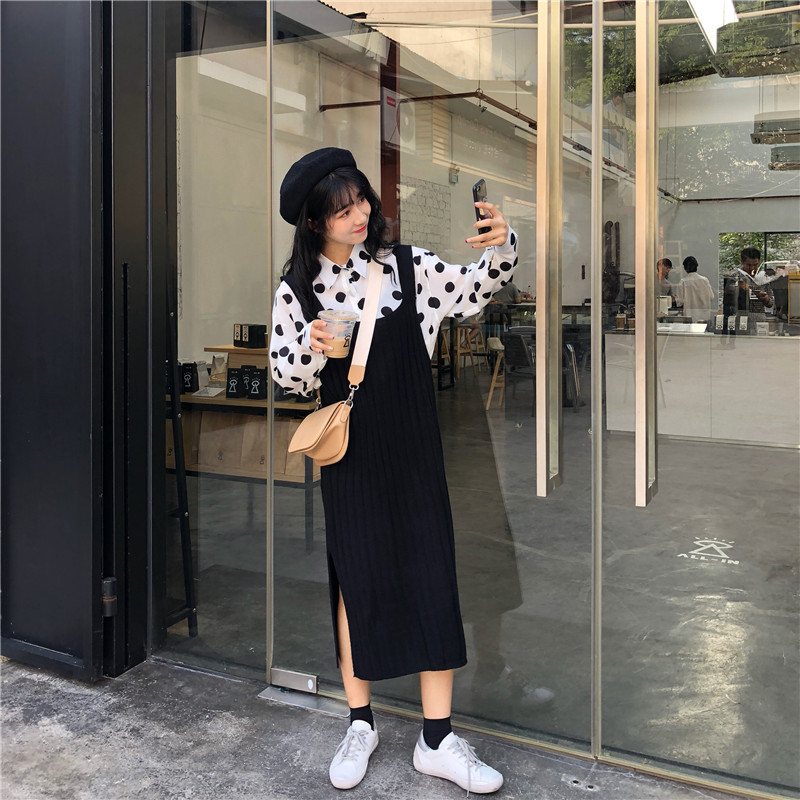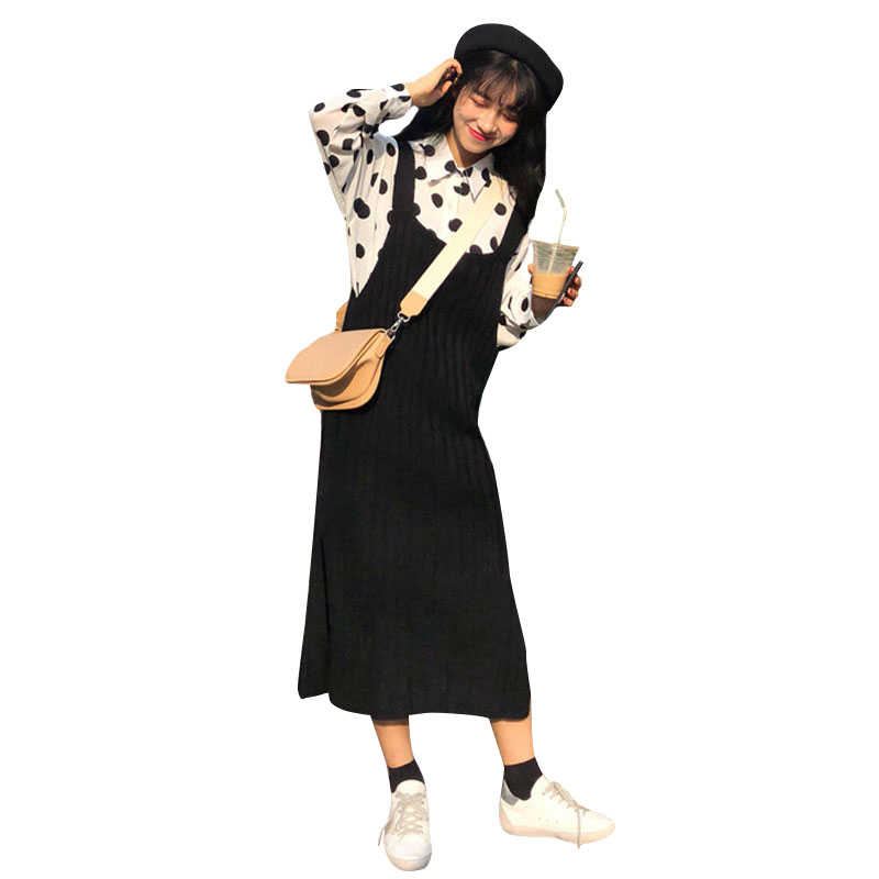 / 韓版時尚休閑套裝秋季女裝chic波點襯衣+針織背帶裙連衣裙兩件套