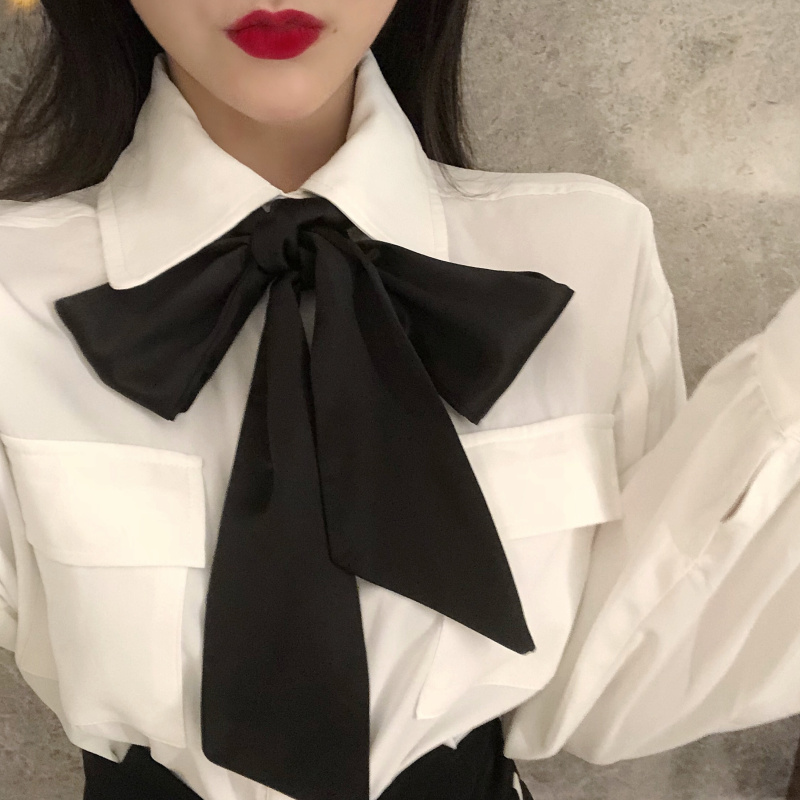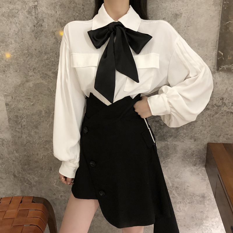 2018秋裝新款韓版套裝領帶燈籠袖襯衫chic風不規則半身裙秋裙子女