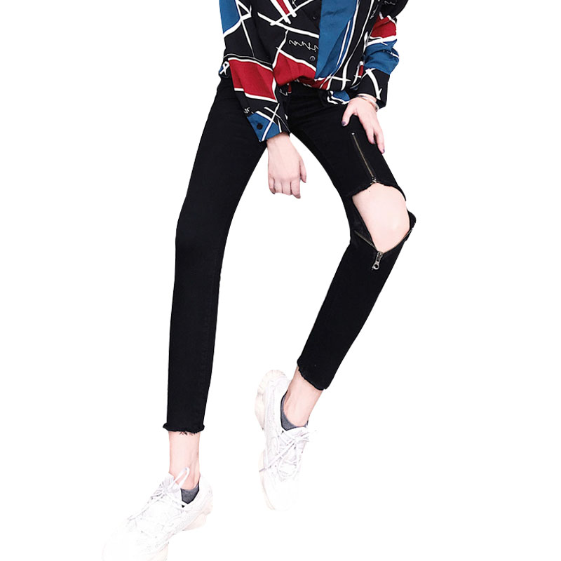 秋季韓版個性拉鏈膝蓋破洞黑色牛仔褲高腰緊身彈力九分褲小腳褲女