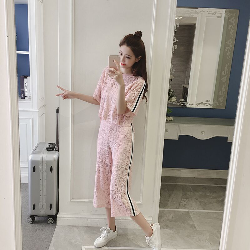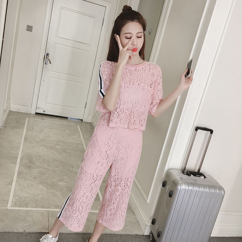 / 夏季新款女裝名媛氣質蕾絲衫上衣兩件套休閑七分闊腿褲套裝韓版潮