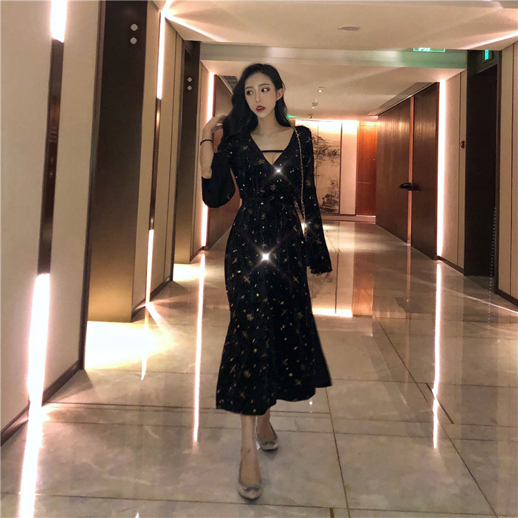 秋冬2018新款復古長袖V領中長款連衣裙小心機時尚顯瘦晚晚風裙子