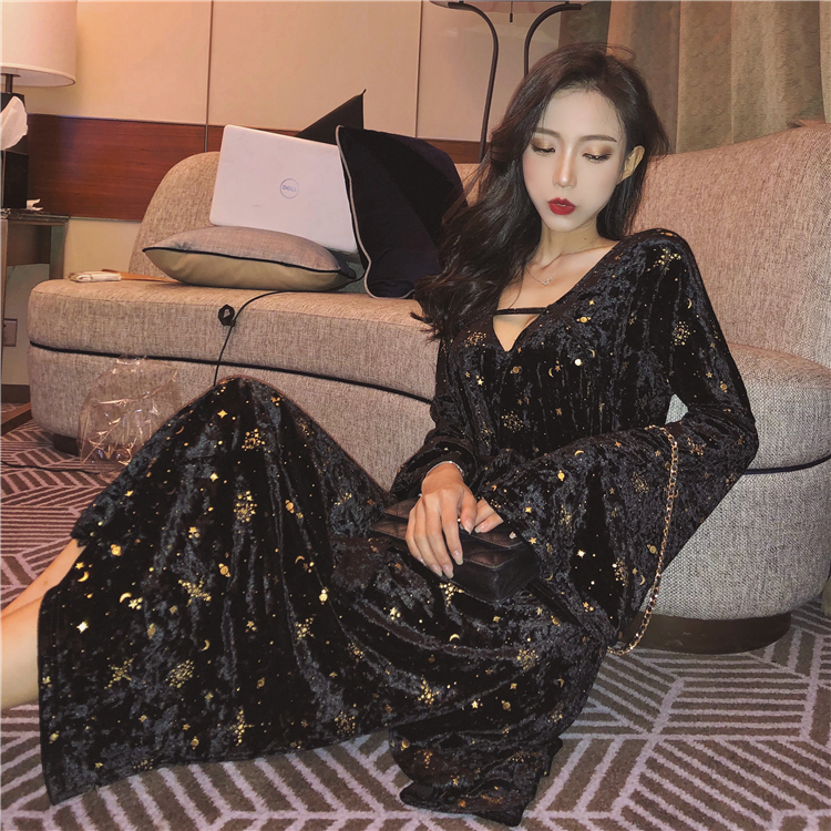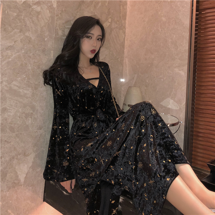 / 秋冬2018新款復古長袖V領中長款連衣裙小心機時尚顯瘦晚晚風裙子