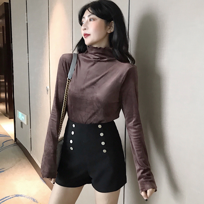 / 高領修身顯瘦打底衫女秋冬裝新款復古絲絨長袖上衣時尚黑色T恤潮