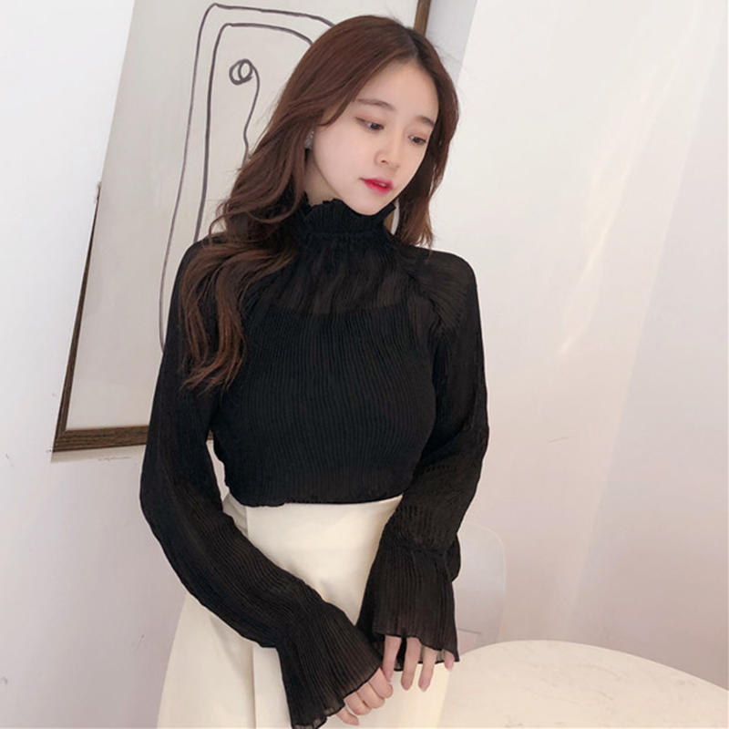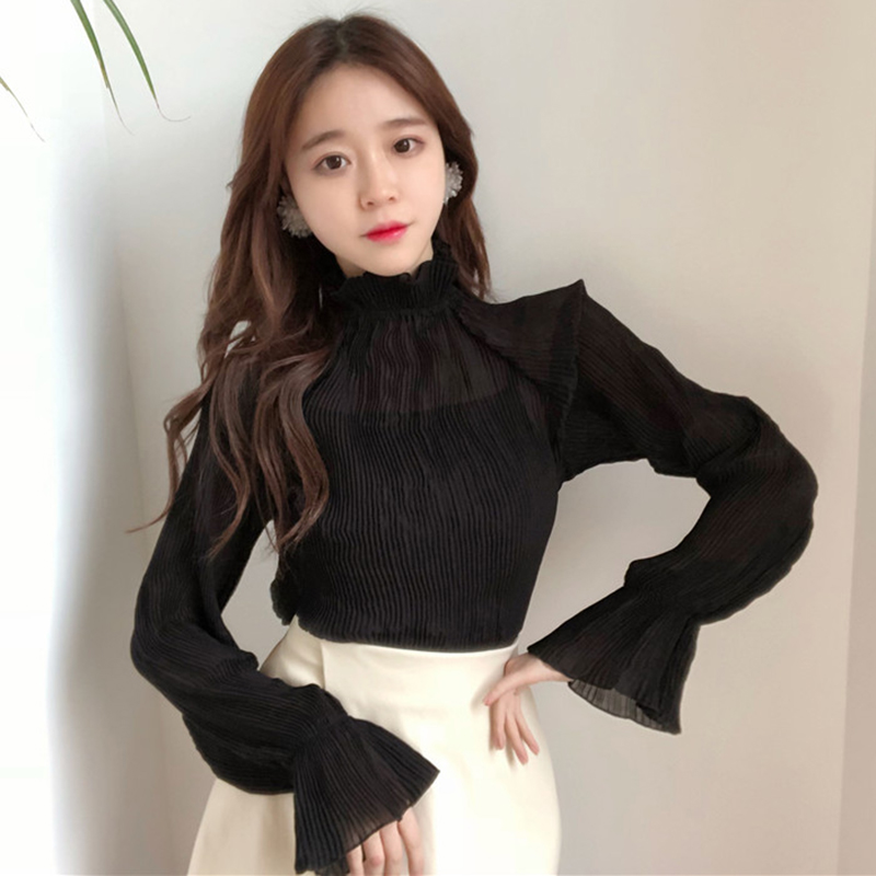 / 秋裝2018新款時尚褶皺喇叭袖上衣氣質黑色雪紡衫打底長袖立領襯衣