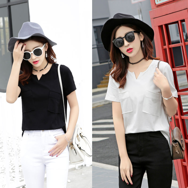 短袖T恤女韓版百搭寬松學生半袖純色打底衫開叉V領上衣夏季潮