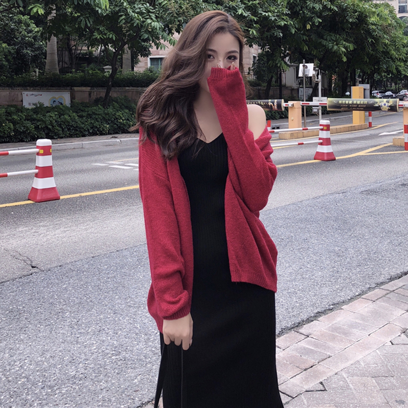 / 港味復古套裝女秋新款寬松毛衣開衫長袖上衣修身針織吊帶連衣裙子