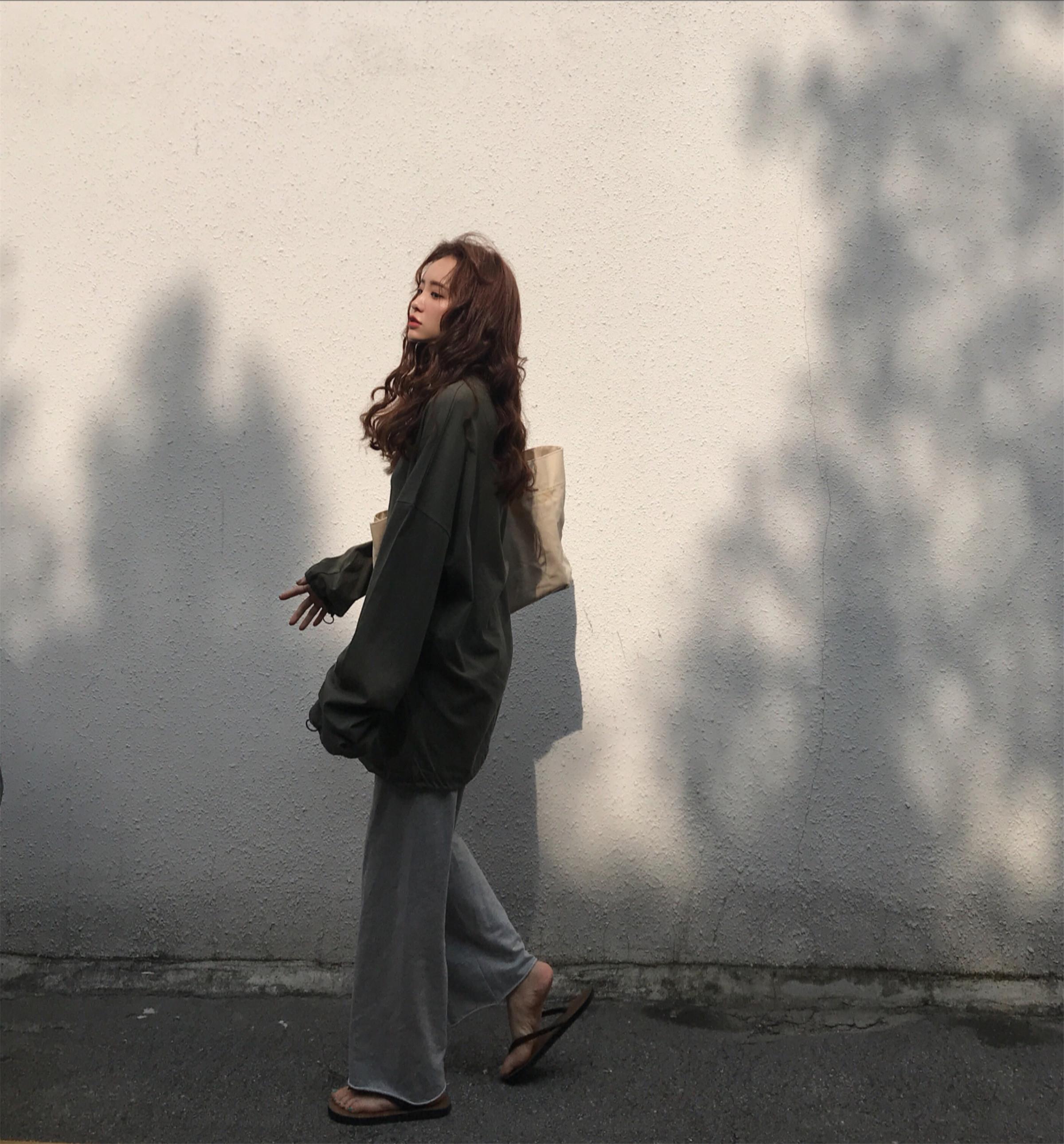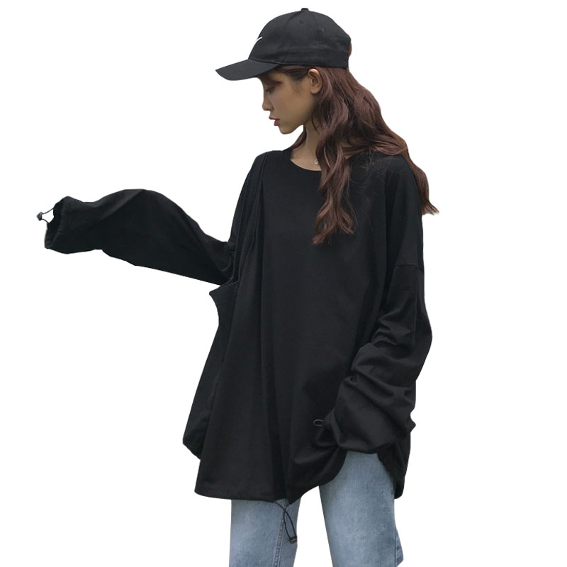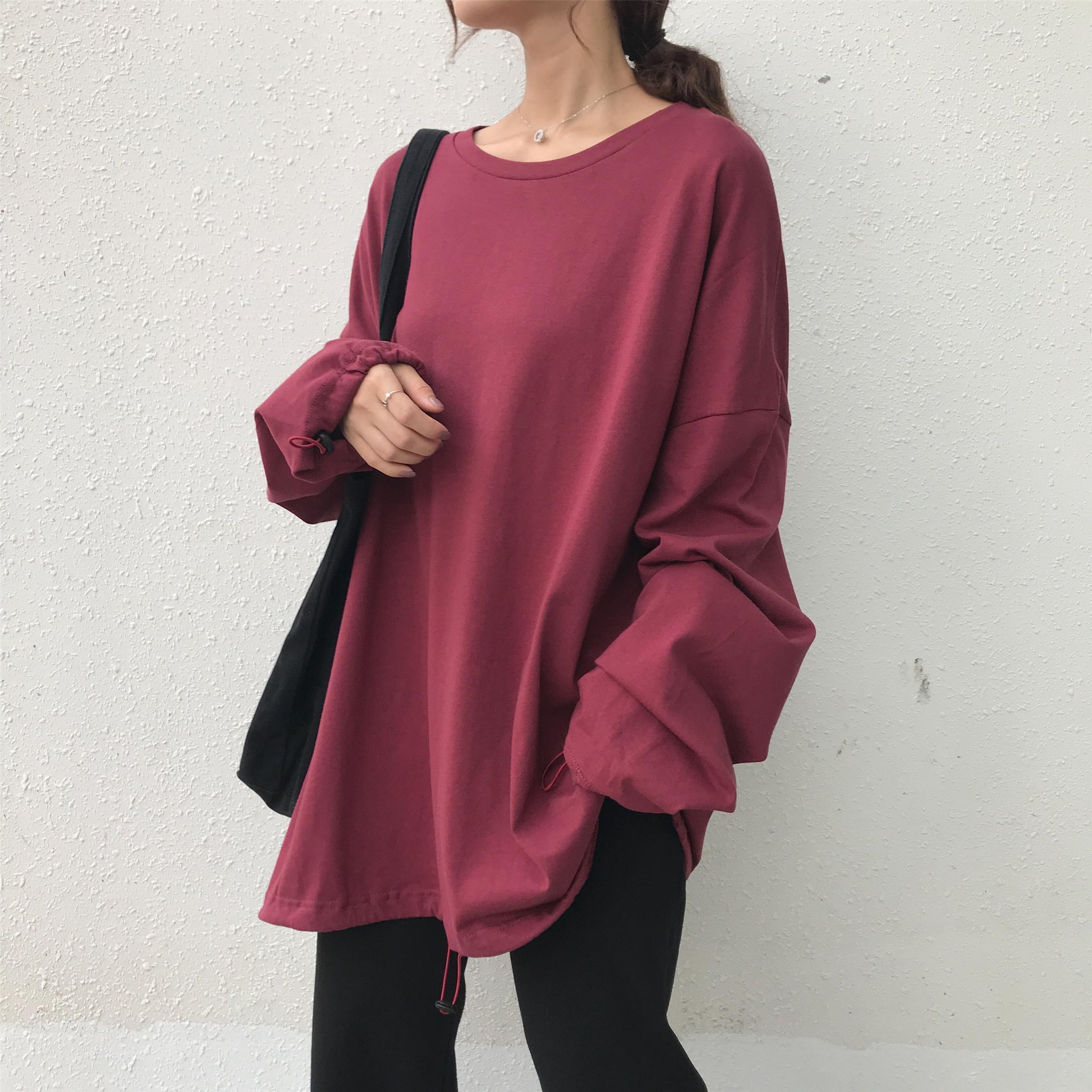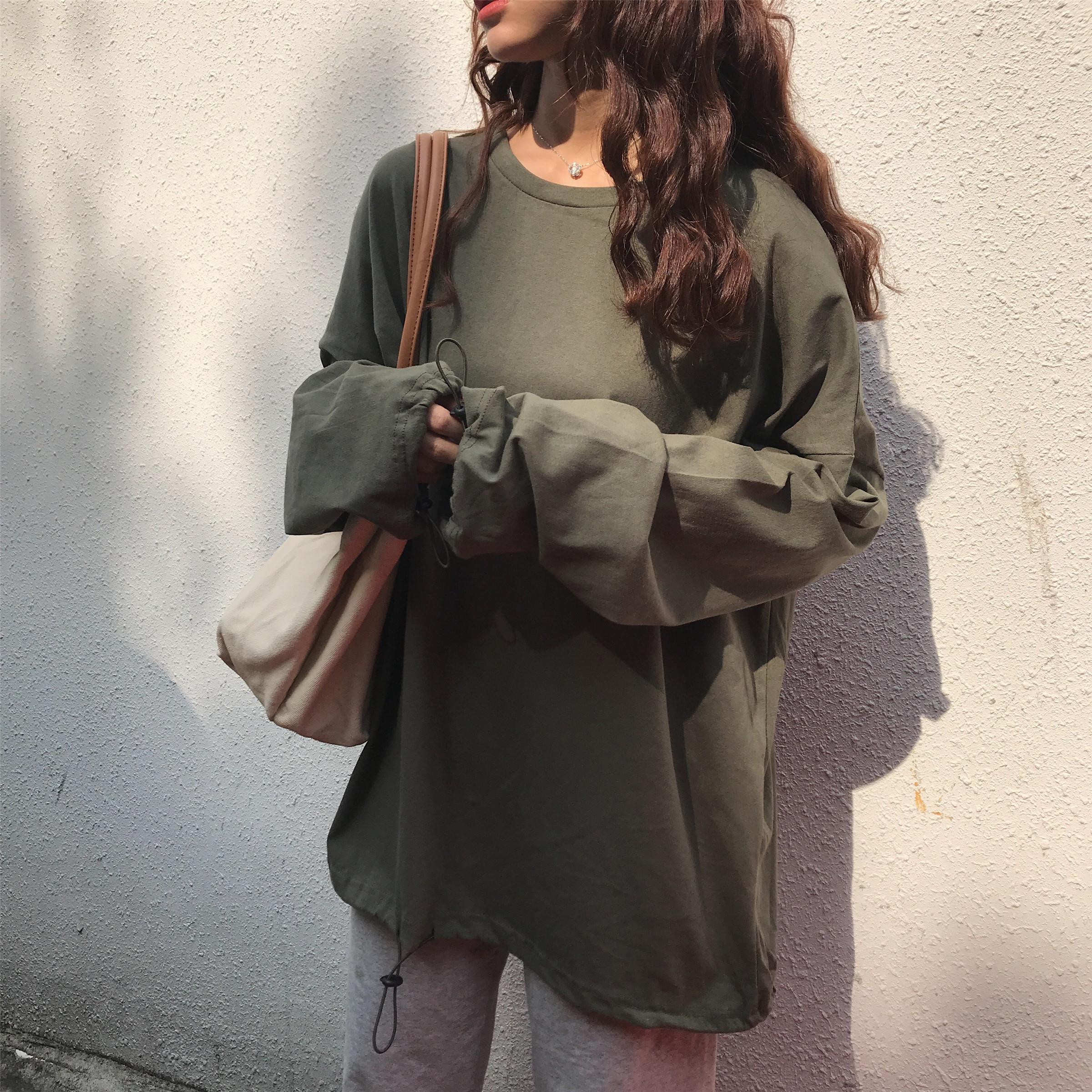 / 秋季女裝韓版寬松慵懶風長袖T恤中長款純色下擺收口顯瘦體恤上衣