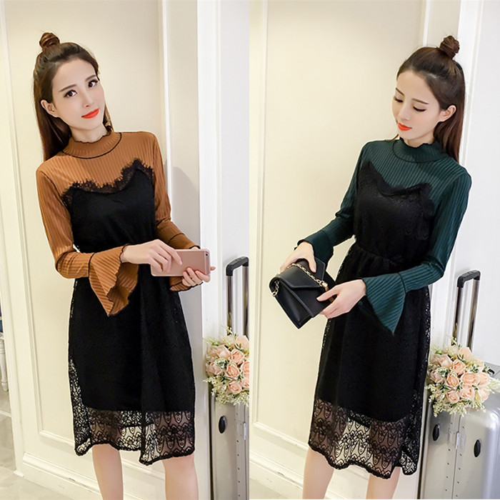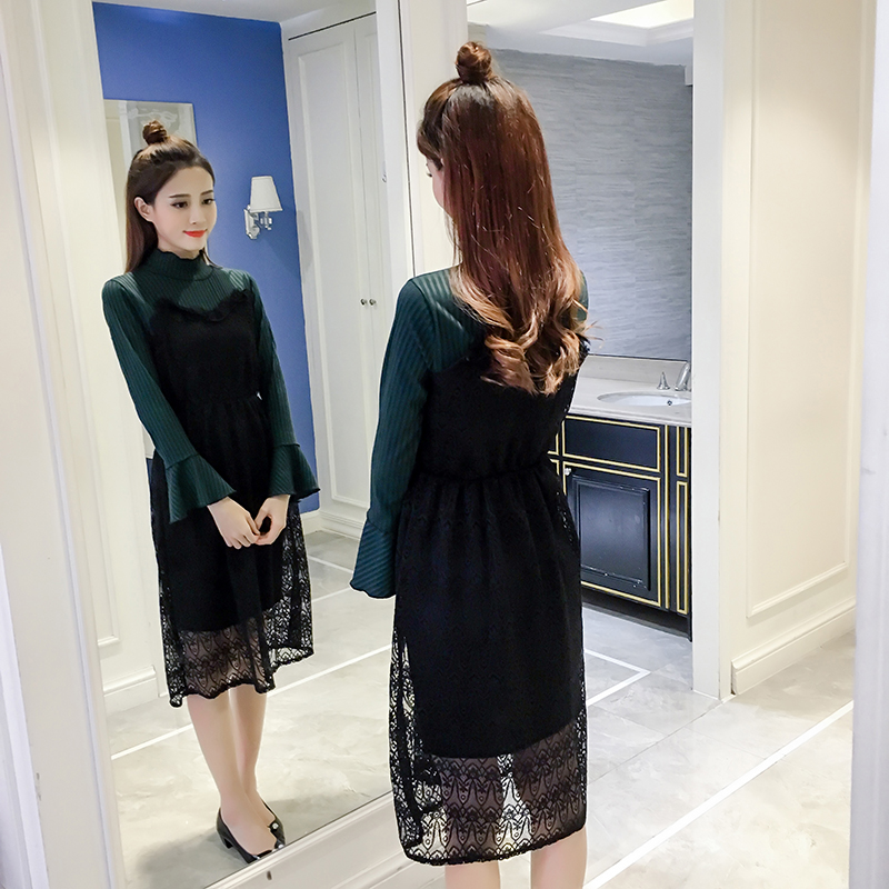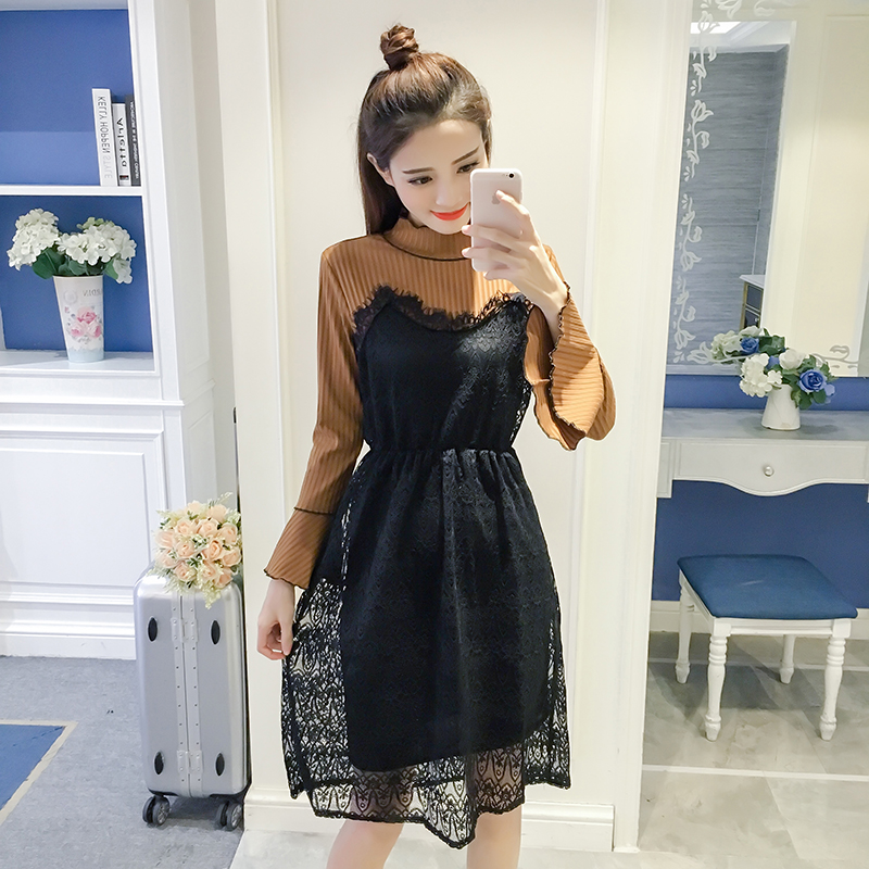 / 春裝新款女裝韓版中長款蕾絲拼接打底裙收腰顯瘦喇叭袖連衣裙