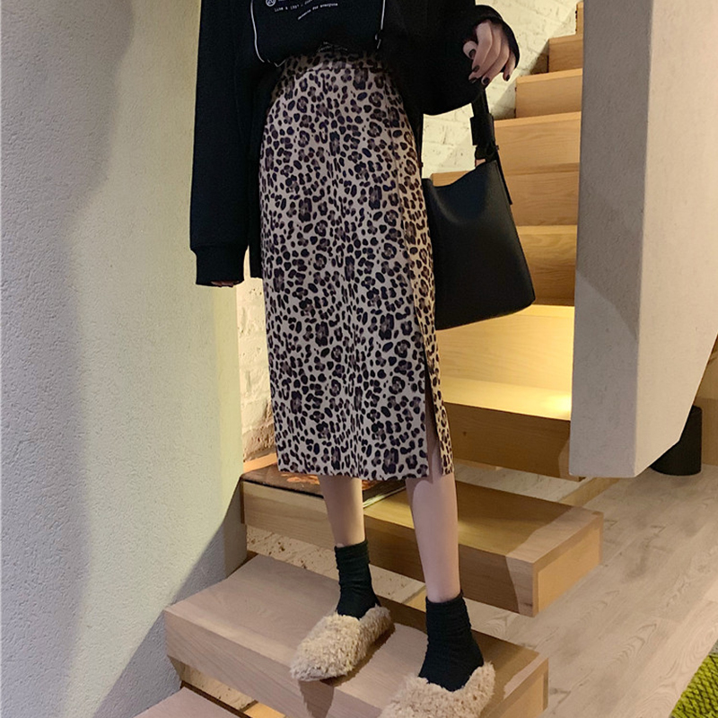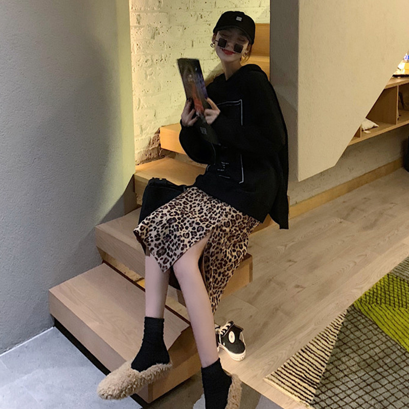 / 套裝女秋冬2018新款寬松長袖外套加絨時尚衛衣高腰開叉豹紋半身裙