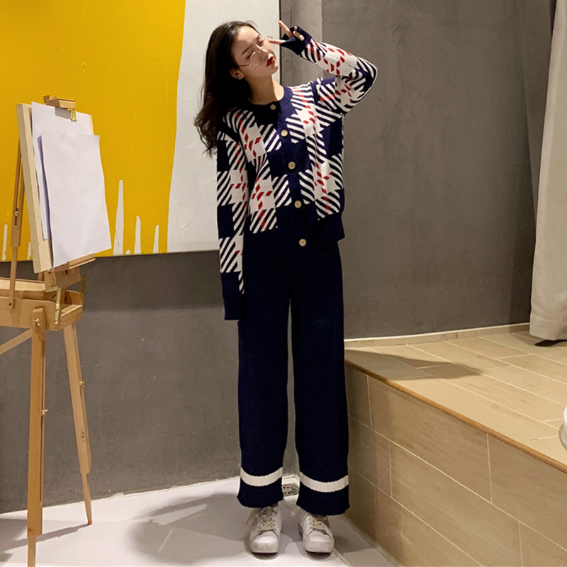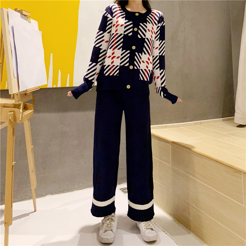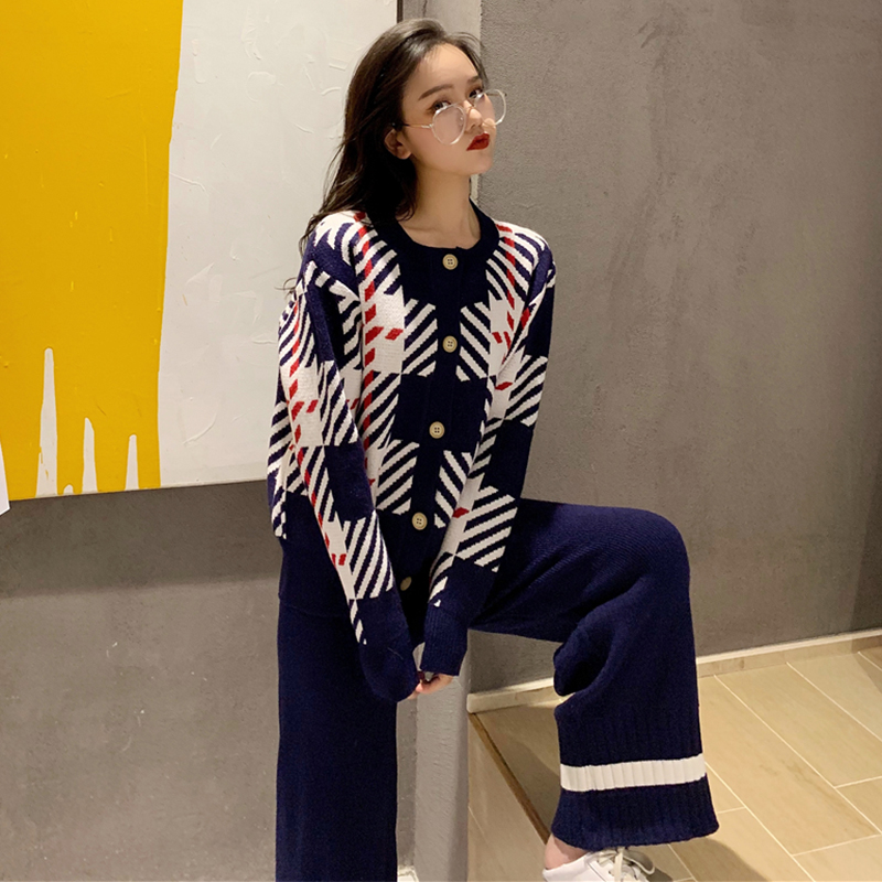 時尚套裝女秋冬新款復古撞色格紋毛衣外套高腰寬松顯瘦針織闊腿褲