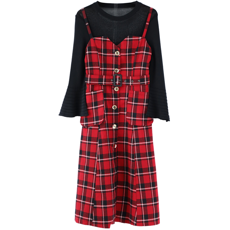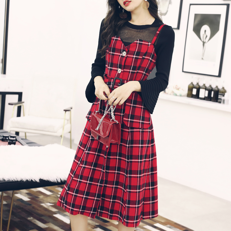 秋裝女2018新款針織長袖上衣吊帶裙兩件套套裝顯瘦收腰格子連衣裙
