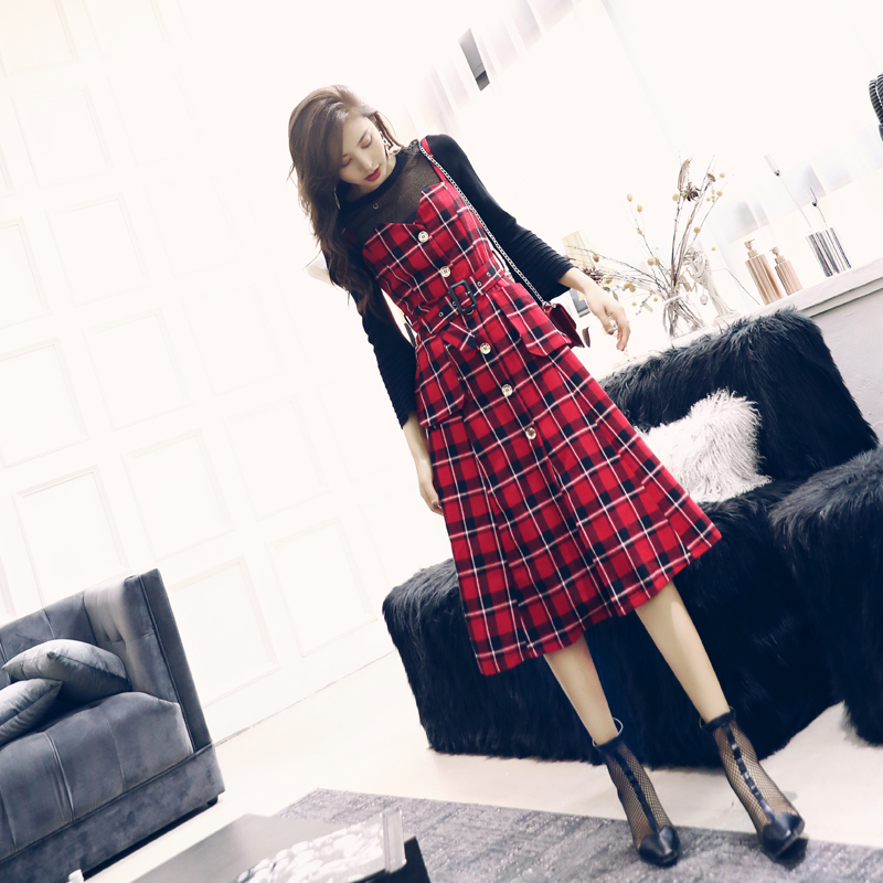 / 秋裝女2018新款針織長袖上衣吊帶裙兩件套套裝顯瘦收腰格子連衣裙