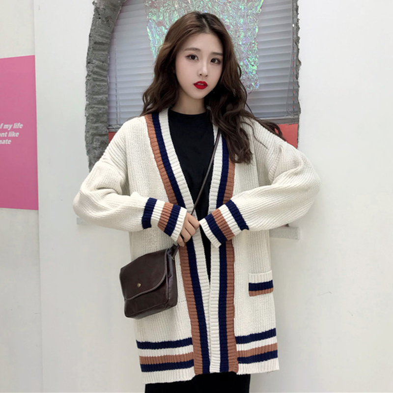 秋季新款女裝寬松中長慵懶風開衫女韓版長袖拼色針織毛衣時尚外套