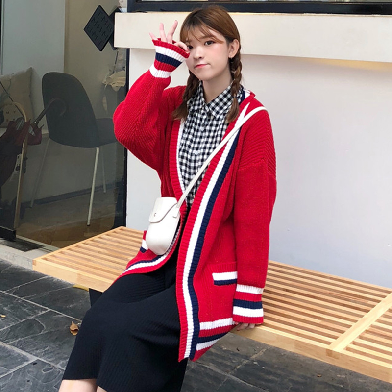 / 秋季新款女裝寬松中長慵懶風開衫女韓版長袖拼色針織毛衣時尚外套