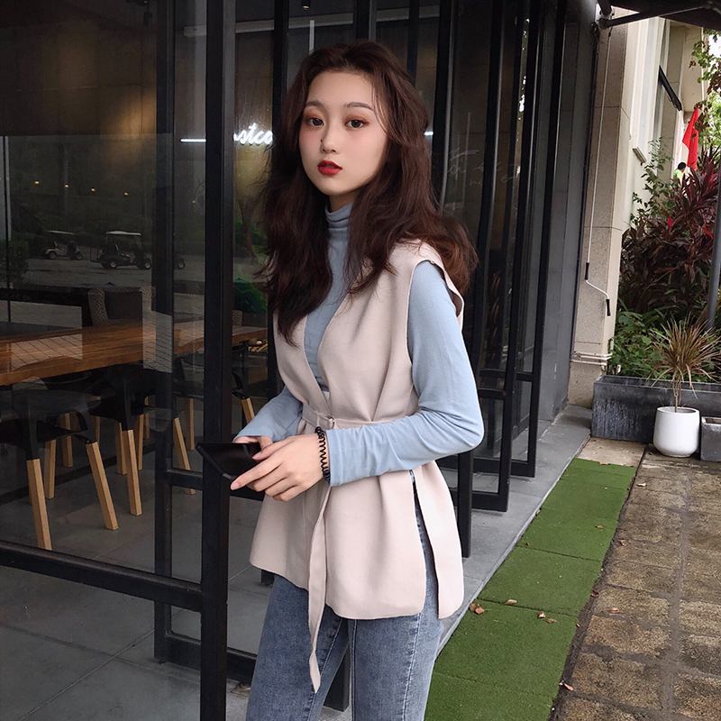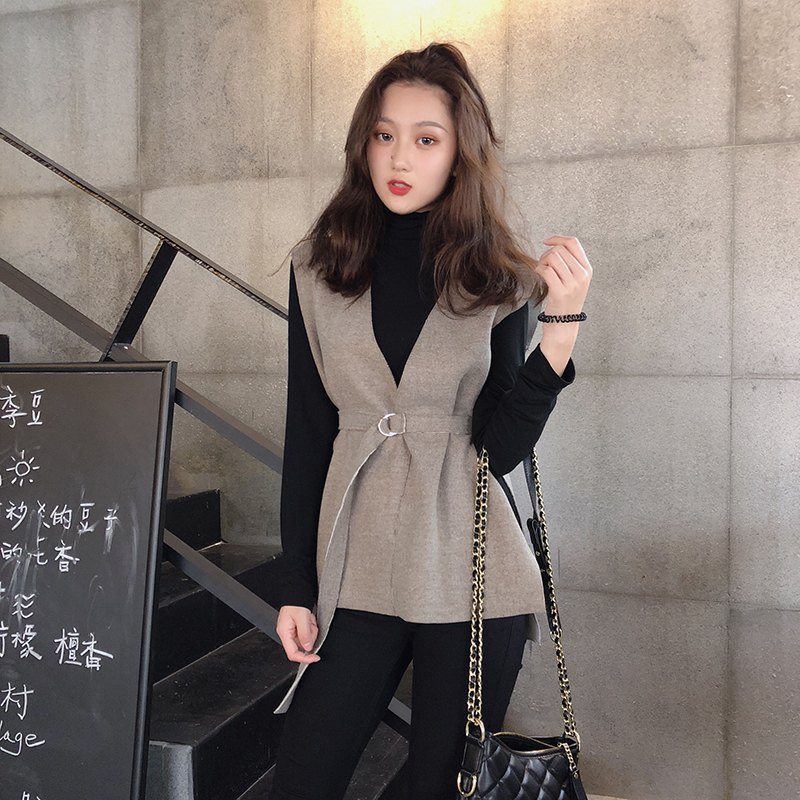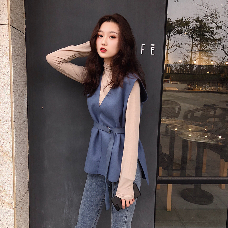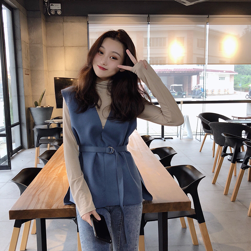 2018冬季新款時尚兩件套港風長袖打底小高領T恤呢料背心馬甲套裝